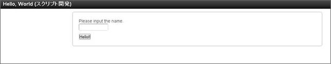 入力画面(input.html)を作成します。プロジェクトの src/main/jssp/src/ の配下に helloworld/js/ という階層でフォルダを作成し、作成したフォルダ配下に「 input.html 」ファイルを作成し、 以下のように実装をします。<!-- HEADタグ --> <imart type="head"> <title>Hello, World</title> <script type="text/javascript"> $(function() { $('#button').click(function() { $('#hello_info').submit(); }); }); </script> </imart> <!-- 画面上に表示されるタイトル --> <div class="imui-title"> <h1>Hello, World (スクリプト開発)</h1> </div> <!-- 入力画面 --> <div class="imui-form-container-narrow"> <p> <label>Please input the name. </label> </p> <!-- Formの設定 actionに出力結果のパスを入力 --> <form action="helloworld/output" name=form id="hello_info" method="post"> <div> <!-- テキストボックスの設定 --> <imart type="imuiTextbox" id="name" name="name" size="10" ></imart> </div> <!-- submitボタンの設定 --> <imart type ="imuiButton" value="Hello!!" name="button" class="mt-10" id="button" inputType="submit"></imart> </form> </div>注意