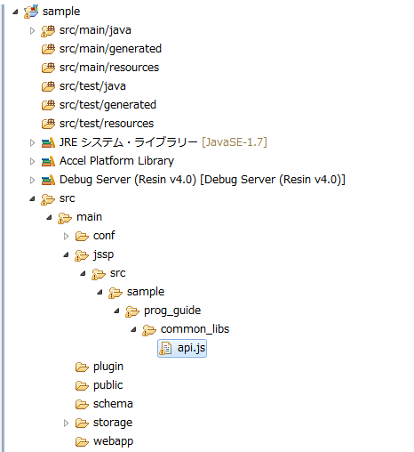 intra-mart e Builder for Accel Platform でプロジェクトを作成する際は 「im」 で始まる名前は利用できません。ファイルに内容を加えます。記述方法は、<java-script-api><api-script>オブジェクトを定義した js ファイルパス#オブジェクト</api-script></java-script-api>です。<?xml version="1.0" encoding="UTF-8"?> <initializer-config xmlns="http://intra-mart.co.jp/system/secure/product/initializer/config/initializer-config" xmlns:xsi="http://www.w3.org/2001/XMLSchema-instance" xsi:schemaLocation="http://intra-mart.co.jp/system/secure/product/initializer/config/initializer-config ../../../schema/initializer-config.xsd "> <java-script-api> <api-script>sample/prog_guide/common_libs/api#StaticApi</api-script> </java-script-api> </initializer-config>