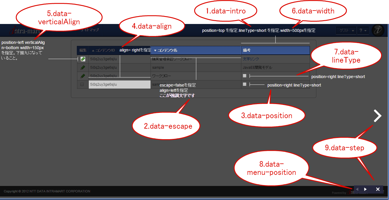 short(50px),middle(100px),long (200px)の長さです。8 data-menu-position right ステップメニューの表示位置を指定します。right,left の指定が可能です。同じステップ内で別々の指定をした場合は、最初に指定した値が有効です。9 data-step 全表示 説明を表示する順番を数値で指定します。同じ数値を指定した場合は、複数個の説明が同時に表示されるのでグループ化としても利用できます。未指定の要素は最後に表示されます。