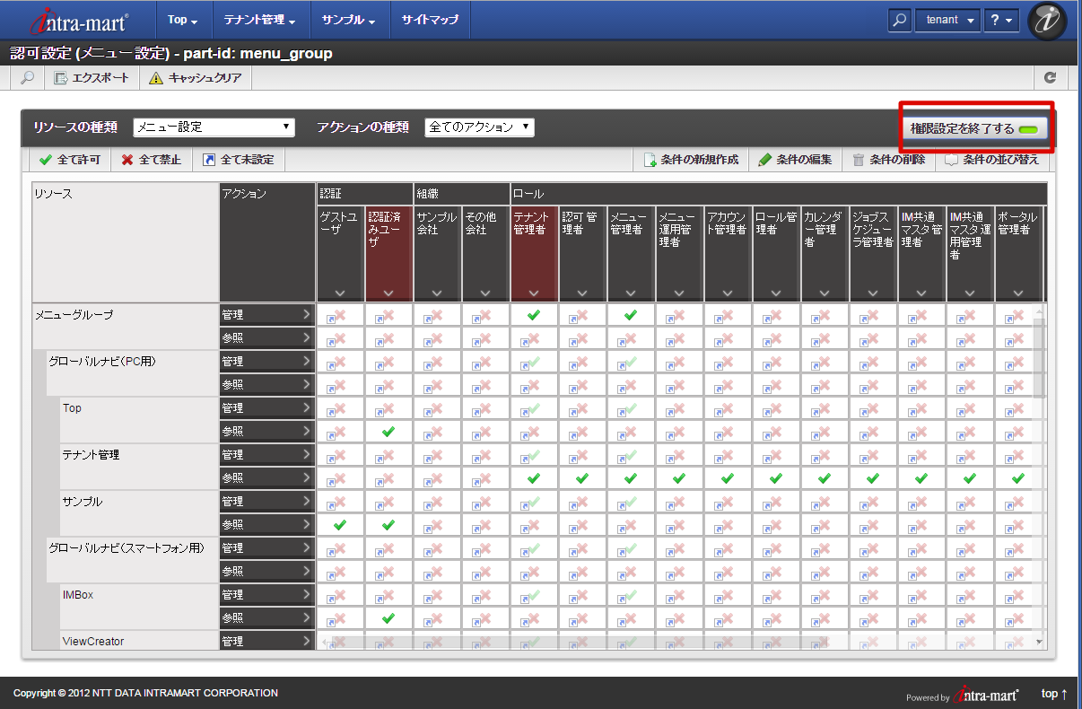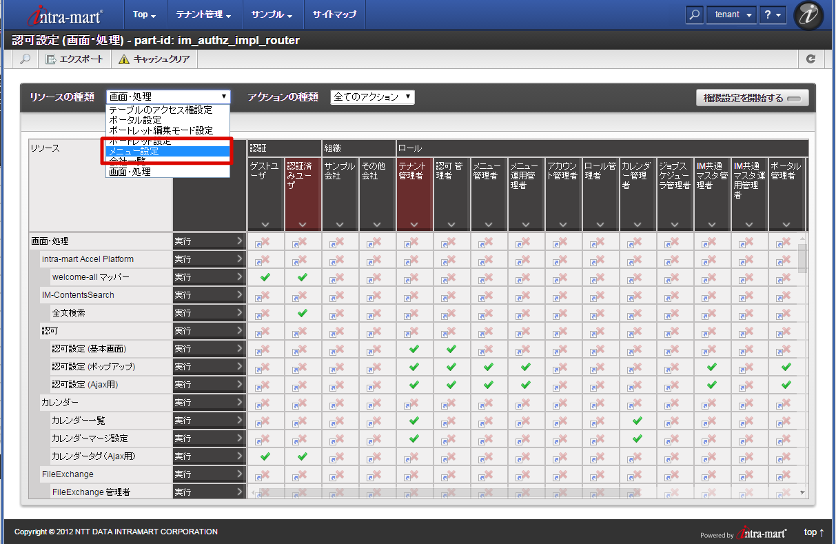 グローバナビから「テナント管理」→「認可」をクリックします。