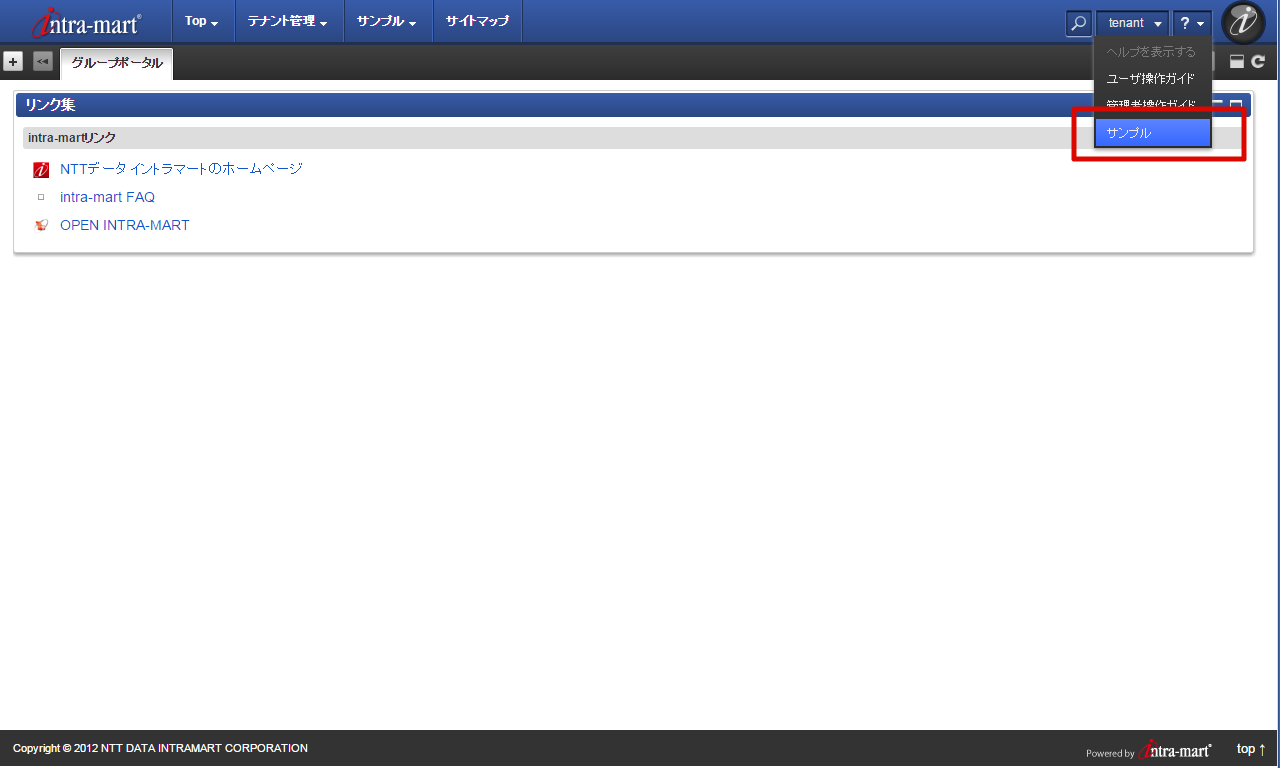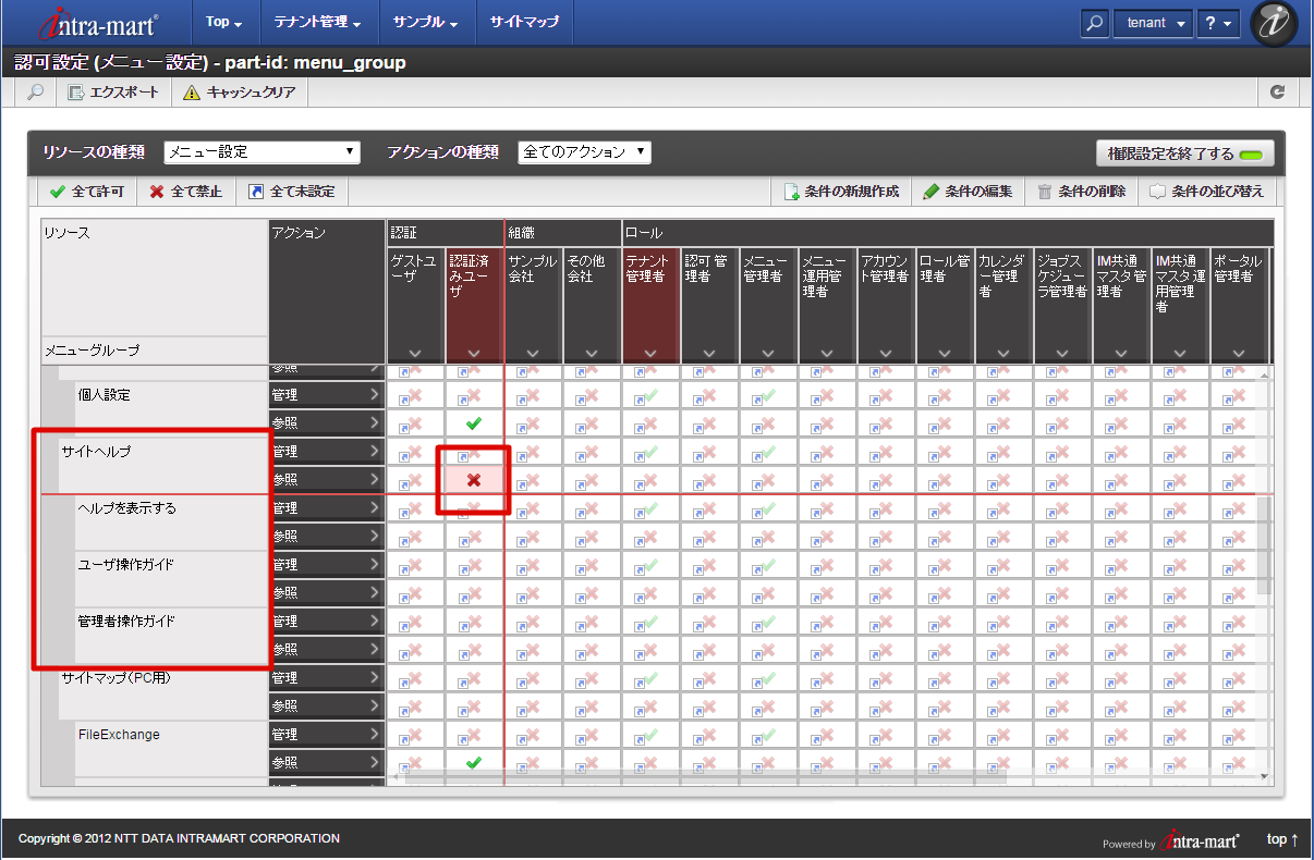 リソースグループ名「サイトヘルプ」配下のメニューグループに、それぞれ認可を設定することができます。ここでは、認証済みユーザの参照に禁止を指定します。 ホーム画面に遷移すると、ヘルプドロップダウンが非表示になっていることが確認できます。コラム