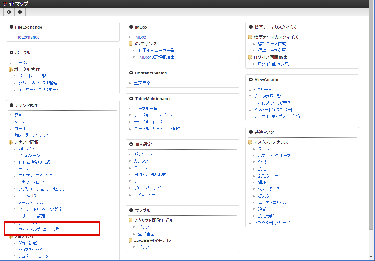 「サイトマップ」→「テナント管理」→「テナント情報」→「サイトヘルプメニュー設定」をクリックします。