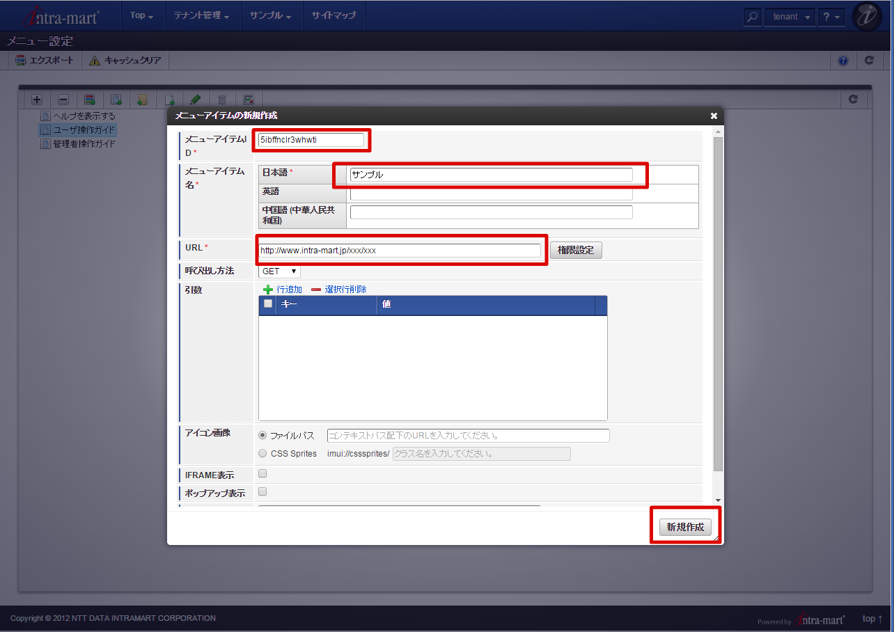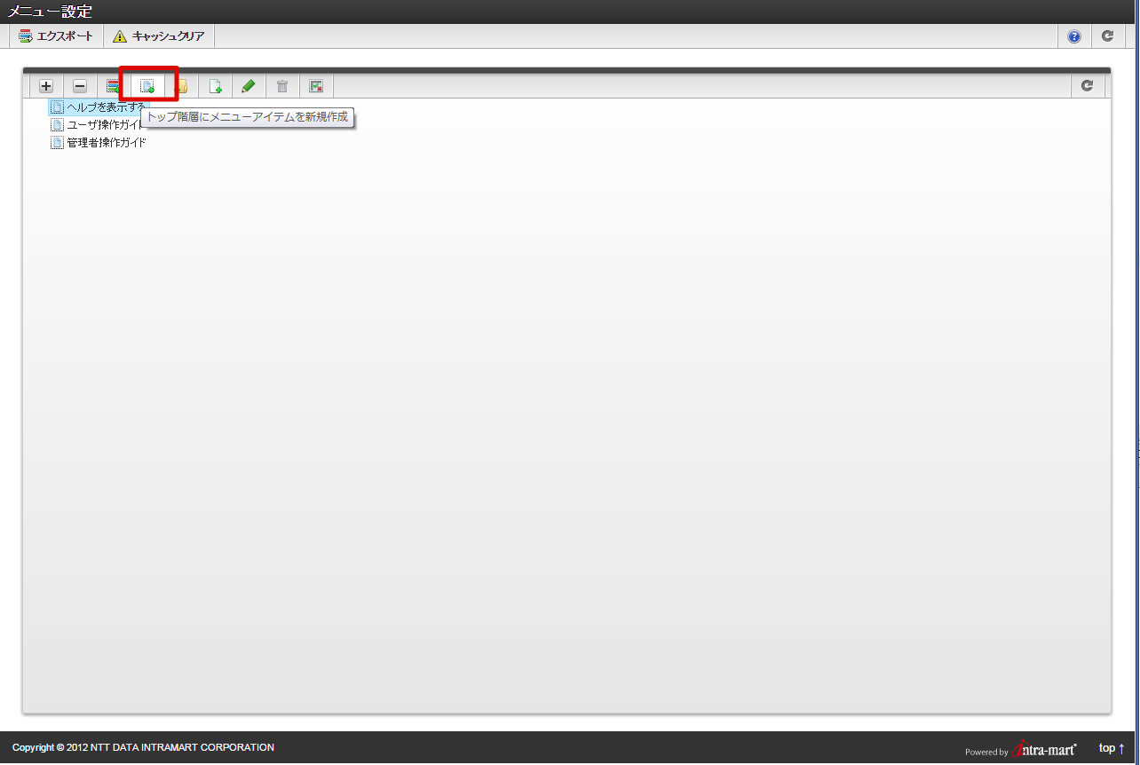 メニューを追加する場合は、トップ階層にメニューアイテムを新規作成してください。メニューグループやメニューフォルダを追加しても反映されません。 反映される設定は、「メニューアイテムID」「メニューアイテム名」「URL」「ポップアップ表示」だけです。他の設定は、入力しても反映されません。 「ヘルプを表示する」アイテムは、既存の設定を変更しないでください。特に「メニューアイテムID」を変更すると、簡易ヘルプ機能が動作しなくなるので注意してください。「URL」「ポップアップ表示」は、設定しても反映されません。