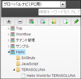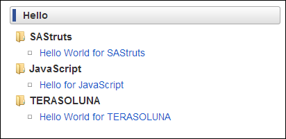 メニューアイテム名(日本語) Hello World for TERASOLUNA URL sample/tgfw/hello また、メニューを閲覧できるようにするために作成した「 Hello 」グループに以下のように認可を設定します。本項では、Hello グループに対してゲストユーザと認証ユーザの参照を許可するように設定します。詳細については 認可 を参照してください。