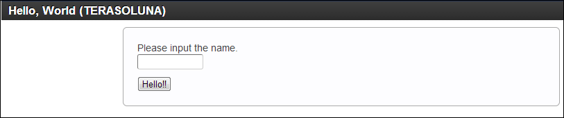 以上の手順で、モジュール・プロジェクト「hello_terasoluna」がインポートされます。次に、モジュール・プロジェクトのプロパティにてWebアーカイブディレクトリを設定し、デバッグサーバを起動します。デバッグサーバ起動後、ブラウザより下記のように直接URLを指定してアクセスすると、入力画面が表示され、Hello World の動作確認が行えます。http://<HOST>:<PORT>/<CONTEXT_PATH>/sample/tgfw/hello
