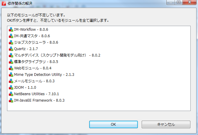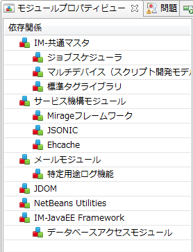 依存関係の定義はモジュール間の関係性を示します。依存関係はモジュールごとに定義を行います。定義されたモジュールは、定義したモジュールを含むwarを作成する際に必須のモジュールとなります。ex. サンプルモジュールのmodule.xml<?xml version="1.0" encoding="UTF-8"?> <module conf:schemaLocation="urn:intramart:jackling:toolkit:configurations configurations.xsd" xmlns="urn:intramart:jackling:module" xmlns:conf="urn:intramart:jackling:toolkit:configurations" xmlns:xsi="http://www.w3.org/2001/XMLSchema-instance" xsi:schemeLocation="urn:intramart:jackling:module module.xsd"> <id>jp.co.sample.sample_module</id> <version>1.0.0</version> <type>module</type> <name>サンプルモジュール</name> <vendor>サンプル会社</vendor> <description>サンプルモジュールです</description> <dependencies> <dependency> <module-id>jp.co.intra_mart.im_workflow</module-id> <verified-version min="8.0.5" max="8.0.7">8.0.5</verified-version> </dependency> </dependencies> </module>例として上記のmodule.xmlで設定されている依存関係の例を見てみます。これは「サンプルモジュール」と名付けられたモジュールのmodule.xmlです。サンプルモジュールは依存関係として、IM-Workflow モジュール(jp.co.intra_mart.im_workflow)を定義しています。これはサンプルモジュールを同梱した環境をwarで作る際に、必ずIM-Workflowモジュールもwarで含まれるように設定しないといけないことになります。実際にIM-Jugglingでwarを作成する際に依存関係に含まれているモジュールが含まれないと依存関係の対象モジュール、およびそのモジュールに依存関係で紐づくモジュールが足りないことをエラーで表示します。選択するモジュールが定義している依存モジュール、および依存関係で紐づくモジュールの一覧は「モジュールプロパティビュー」にて確認することができます。