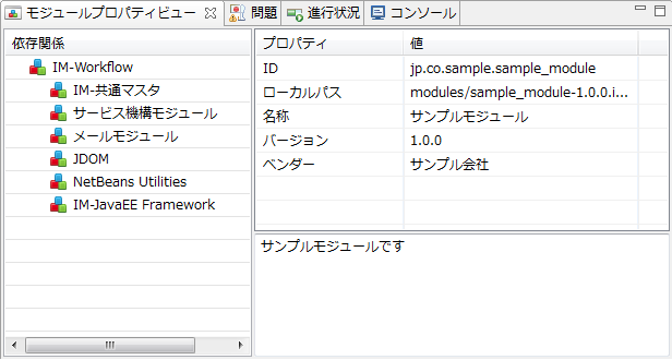 モジュール情報は、プロジェクト直下にあるmodule.xmlにて<module>内にて定義します。定義したモジュールの情報はIM-Jugglingの「モジュールプロパティビュー」にて確認できます。<?xml version="1.0" encoding="UTF-8"?> <module conf:schemaLocation="urn:intramart:jackling:toolkit:configurations configurations.xsd" xmlns="urn:intramart:jackling:module" xmlns:conf="urn:intramart:jackling:toolkit:configurations" xmlns:xsi="http://www.w3.org/2001/XMLSchema-instance" xsi:schemeLocation="urn:intramart:jackling:module module.xsd"> <id>jp.co.sample.sample_module</id> <version>1.0.0</version> <type>module</type> <name>サンプルモジュール</name> <vendor>サンプル会社</vendor> <description>サンプルモジュールです</description> <dependencies> <dependency> <module-id>jp.co.intra_mart.im_workflow</module-id> <verified-version min="8.0.5" max="8.0.7">8.0.6</verified-version> </dependency> </dependencies> </module>
