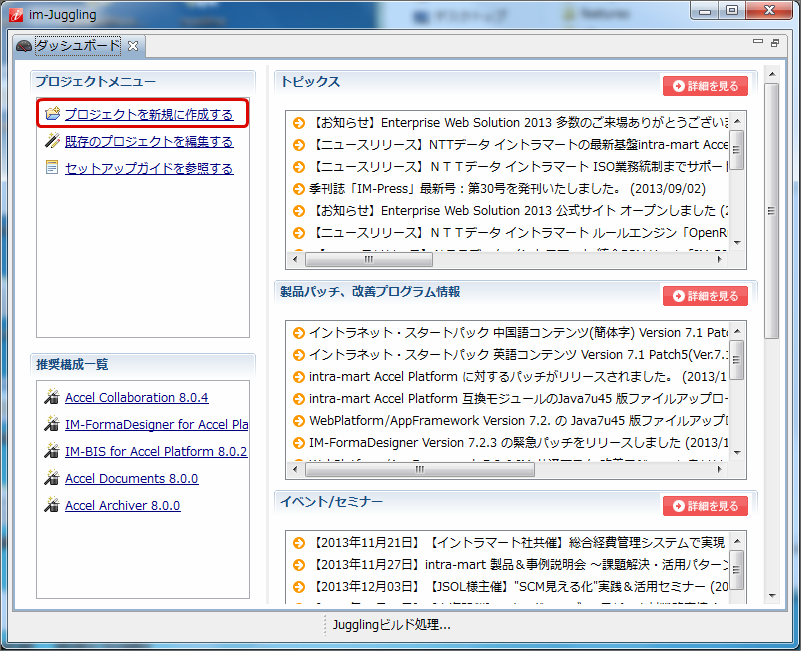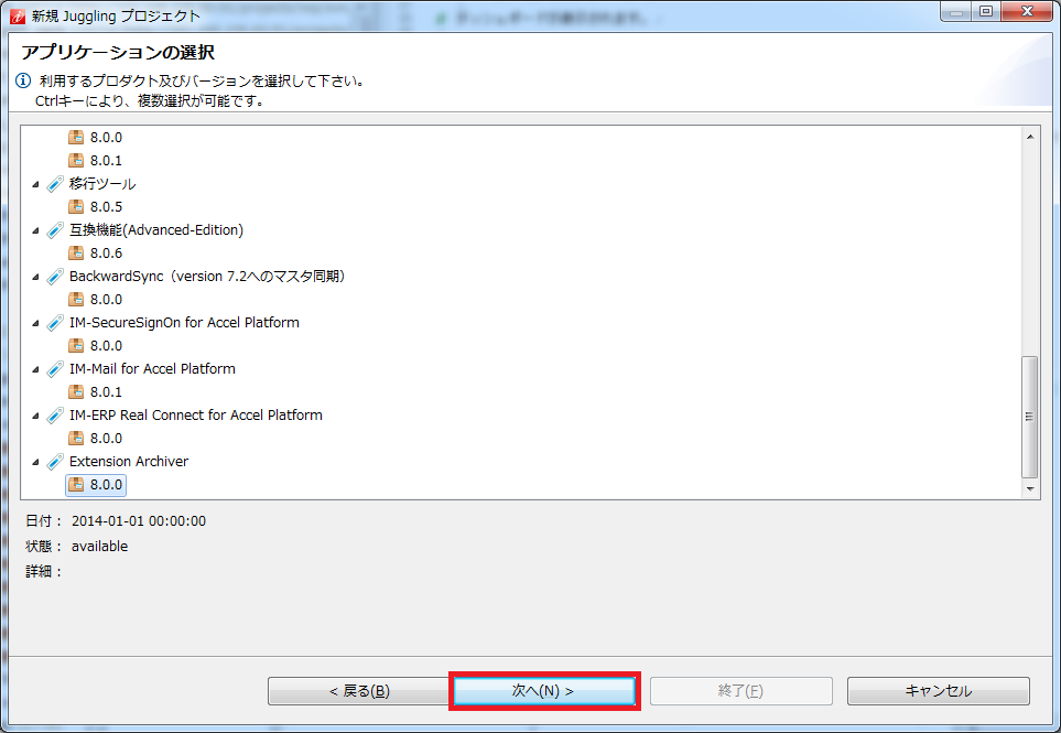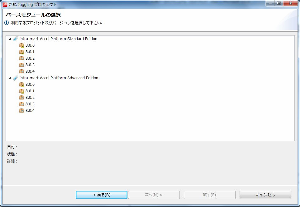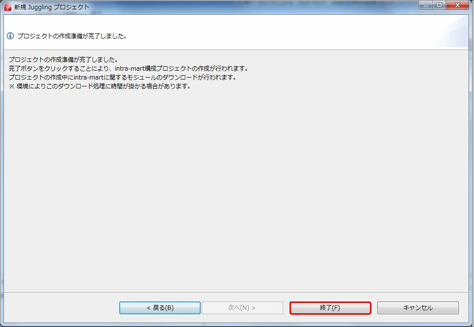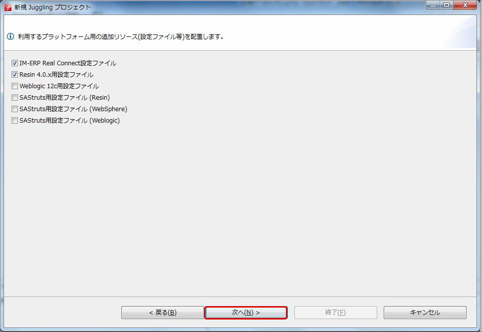 ポップアップ表示されたウィザード画面内の「プロジェクト名」に半角英数字の任意のプロジェクト名を入力します。入力後、「次へ(N)」 をクリックします。 利用するプロダクトおよびバージョンを選択します。選択後、「次へ(N)」をクリックします。 利用するアプリケーションを選択します。IM-Workflow アプリケーション汎用アーカイブ および必要なアプリケーションを選択後、「次へ(N)」をクリックします。 利用するプラットフォーム用の追加リソース(設定ファイル等)を選択します。IM-Workflow アプリケーション汎用アーカイブ では特に追加する物はないので、デフォルトのままで問題ありません。「次へ(N)」をクリックします。最後に「終了(F)」をクリックします。