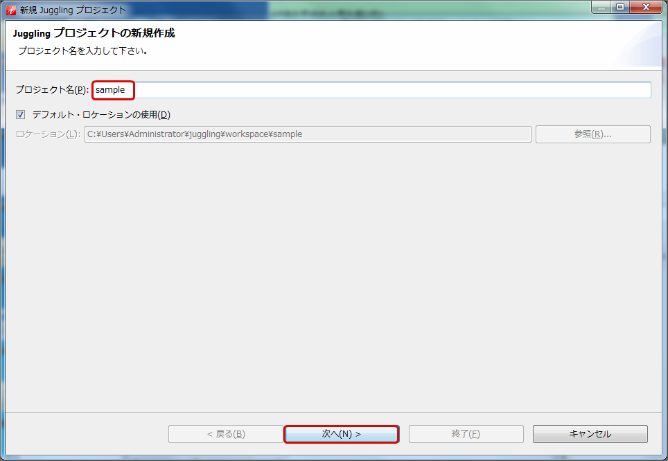 展開したディレクトリ直下にある、 juggling.exe を起動します。