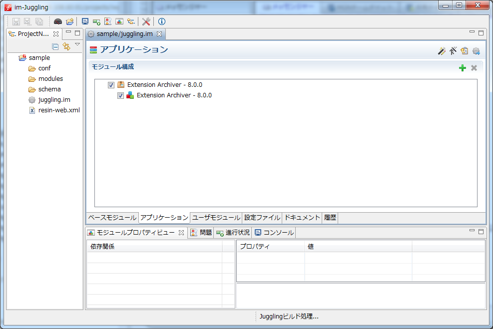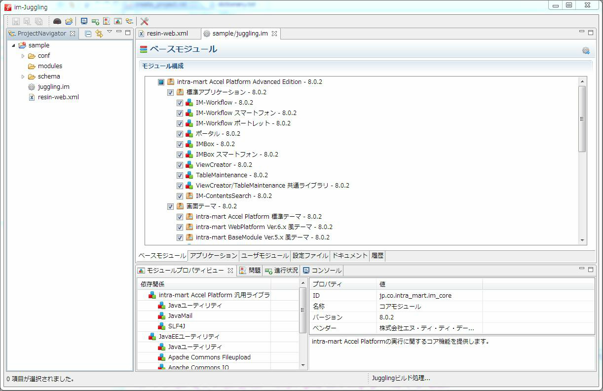 本手順は、「 intra-mart Accel Platform セットアップガイド 」の「 プロジェクトの作成とモジュールの選択 」を実施するときに行います。「IM-Juggling」を使用して、 IM-Workflow アプリケーション汎用アーカイブ をテナントにセットアップします。