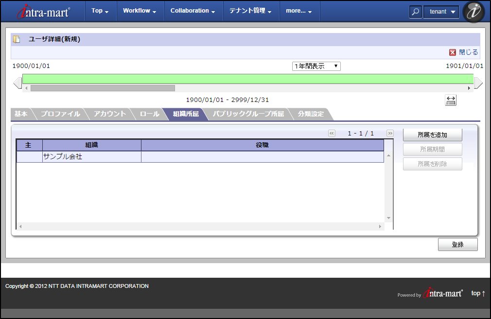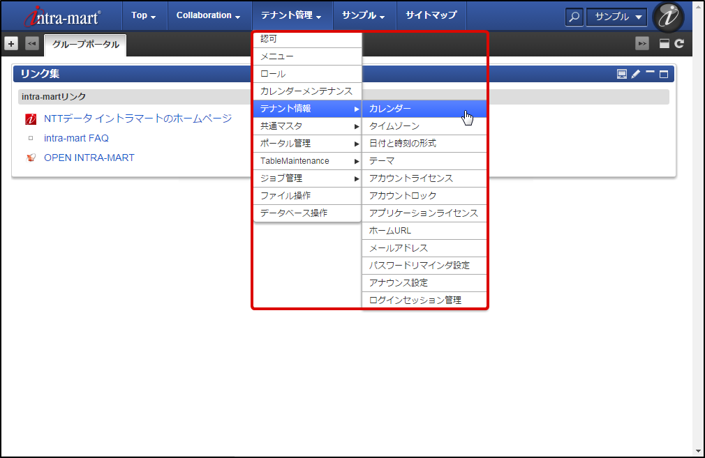 今回作成した「サンプル」ユーザは、 テナント管理者 ロールを付与したため、テナント管理の全てのメニューが利用できます。ステップ2において、管理者が設定するロールによって、利用できるアプリケーション操作が異なります。ロールについては、「 ロール一覧 」を参照してください。
