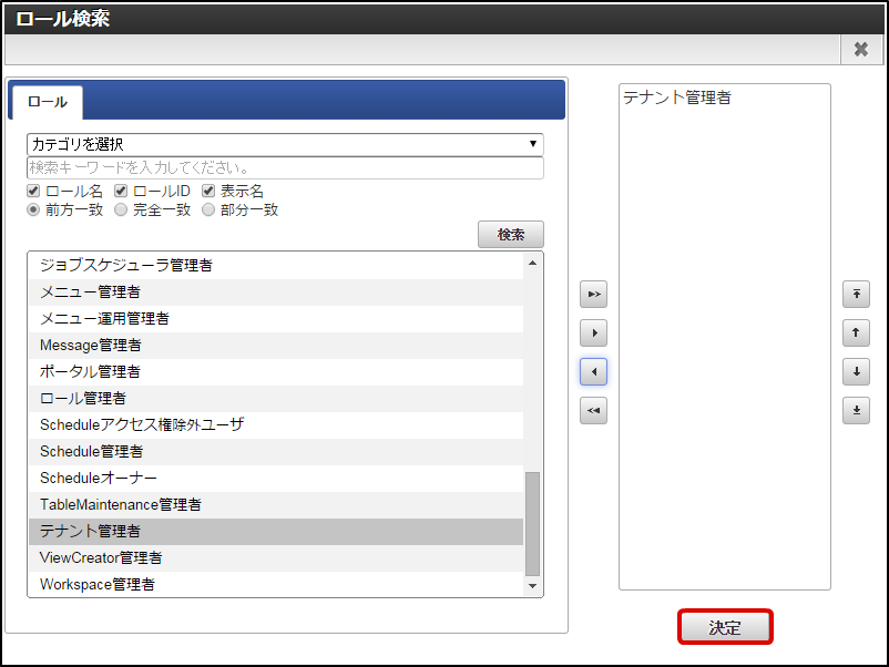 一覧に表示されたロールの中から「テナント管理者」を選択し、右矢印アイコンをクリックして右ペインに表示させます。