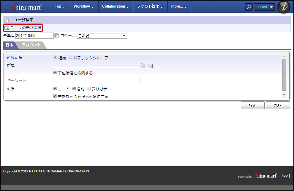 「テナント管理」-「共通マスタ」-「ユーザ」をクリックしユーザ検索画面を開きます。