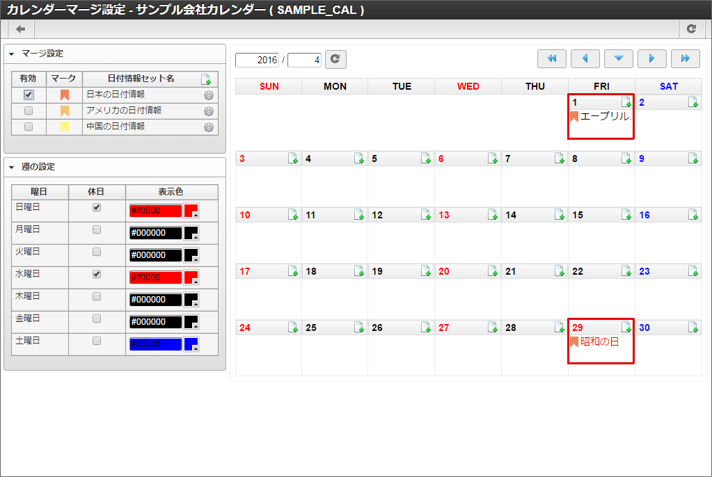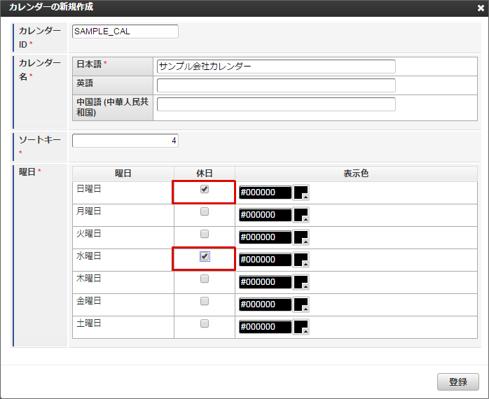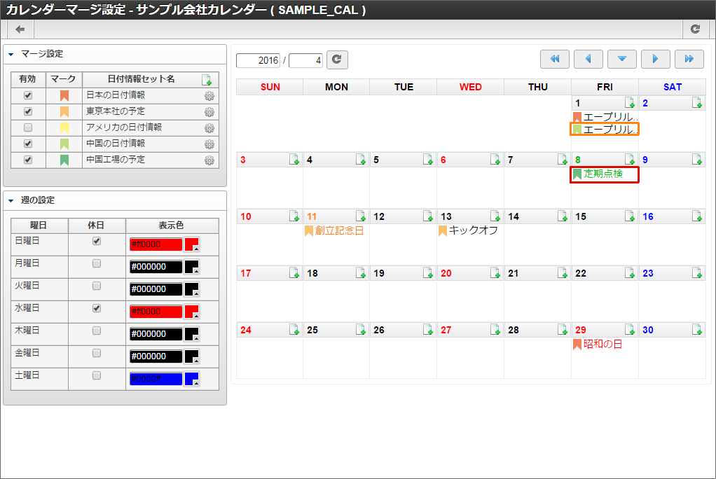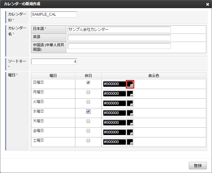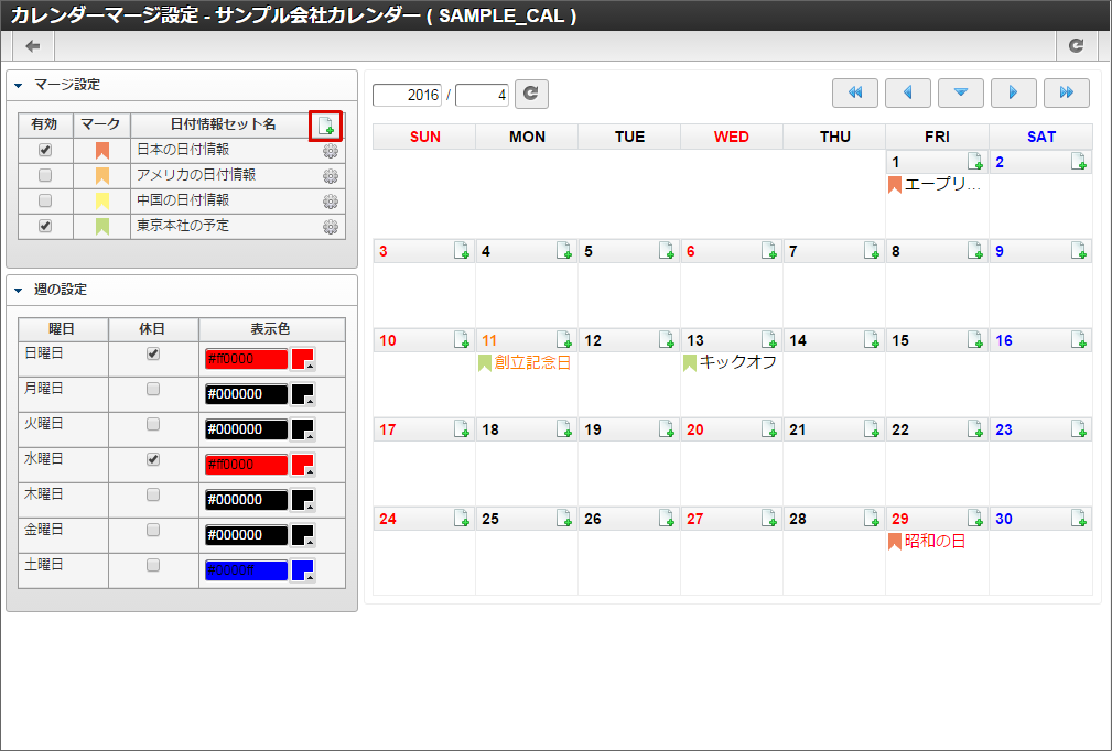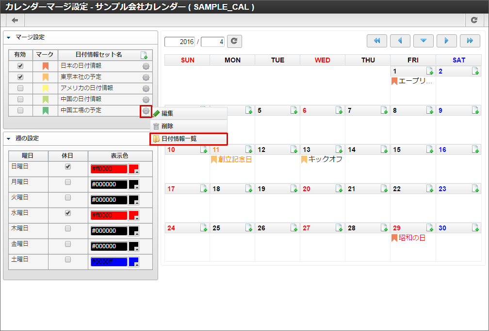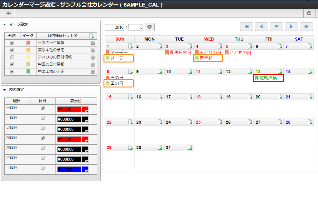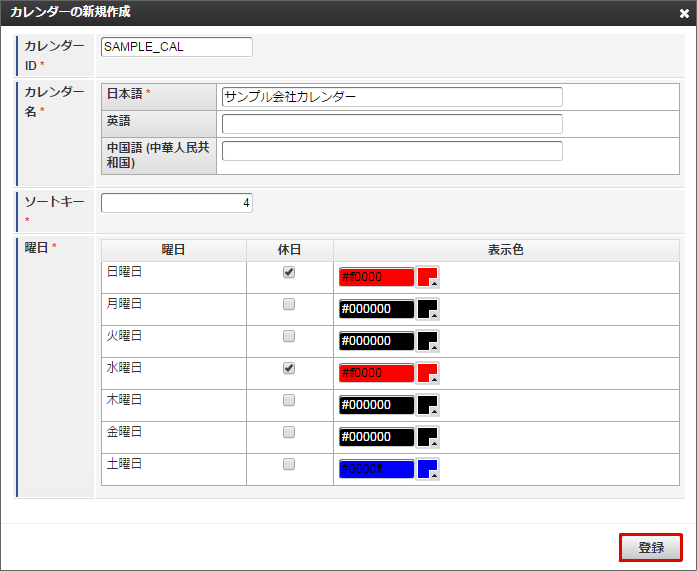 他の休日や土曜日も同様に色の変更を行います。本書では日曜日と水曜日を赤色に、土曜日を青色に変更しました。色の変更が全て完了したら「登録」をクリックします。 カレンダー一覧に「サンプル会社カレンダー」が追加されました。「サンプル会社カレンダー」の「マージ設定」アイコンをクリックします。「サンプル会社カレンダー」を作成できました。