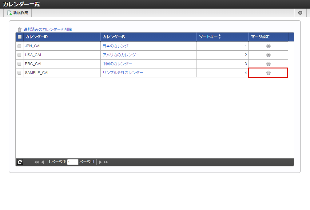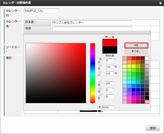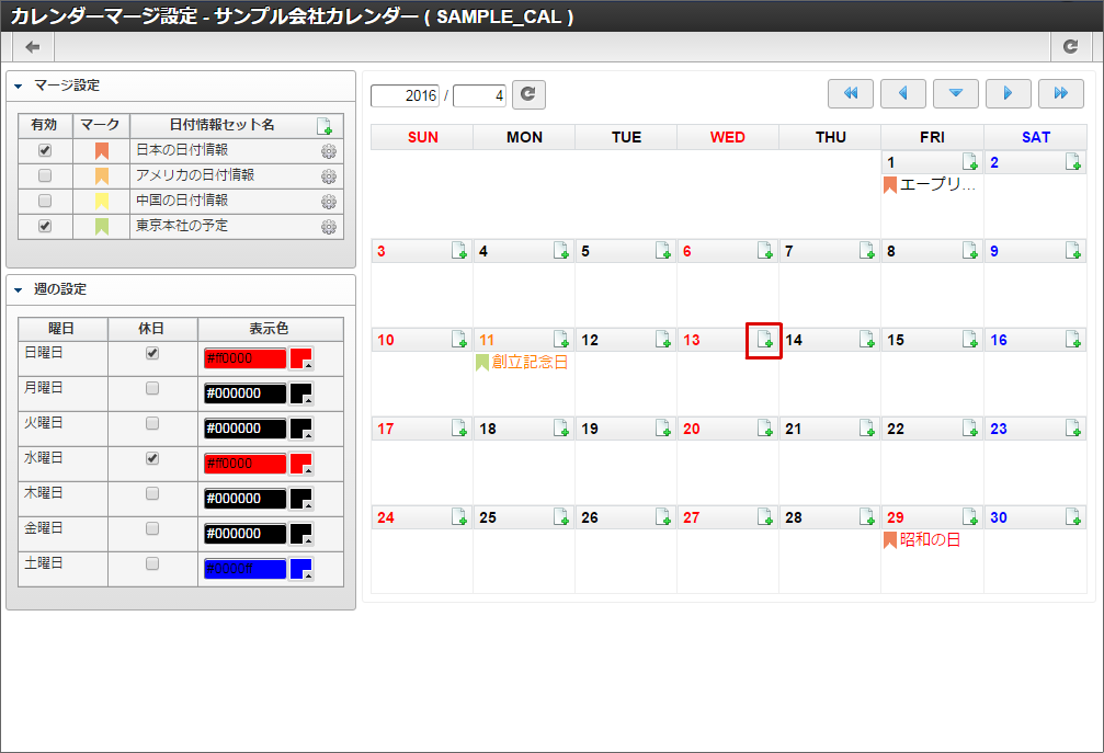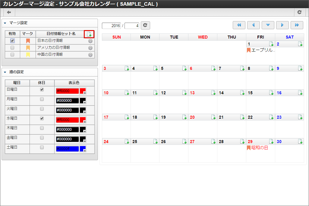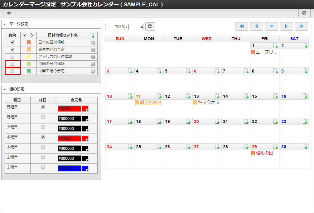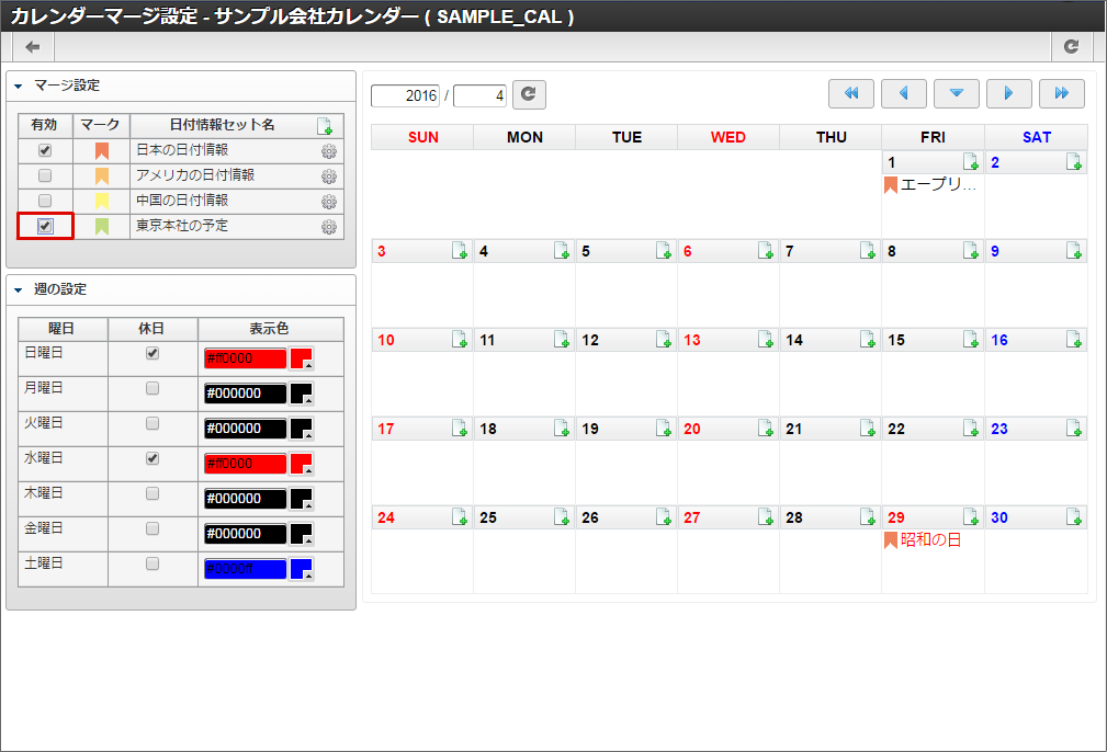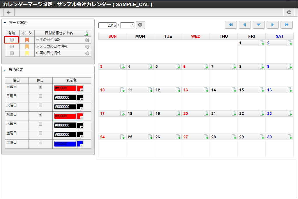 他の休日や土曜日も同様に色の変更を行います。本書では日曜日と水曜日を赤色に、土曜日を青色に変更しました。色の変更が全て完了したら「登録」をクリックします。 カレンダー一覧に「サンプル会社カレンダー」が追加されました。「サンプル会社カレンダー」の「マージ設定」アイコンをクリックします。「サンプル会社カレンダー」を作成できました。