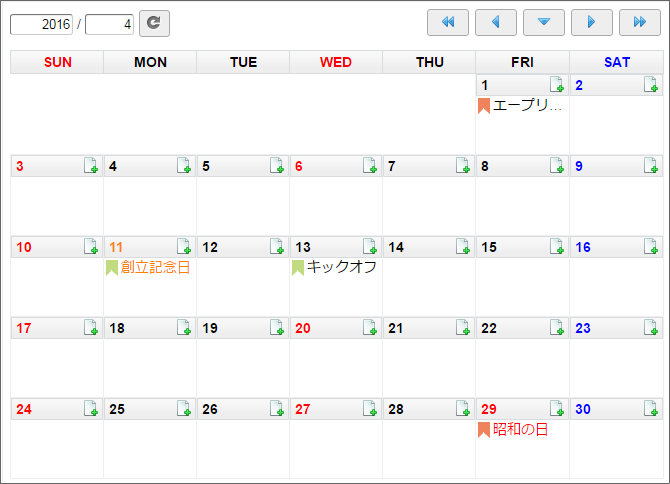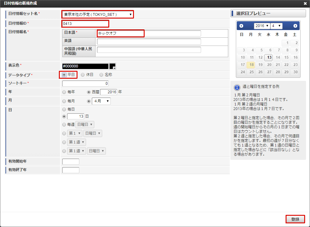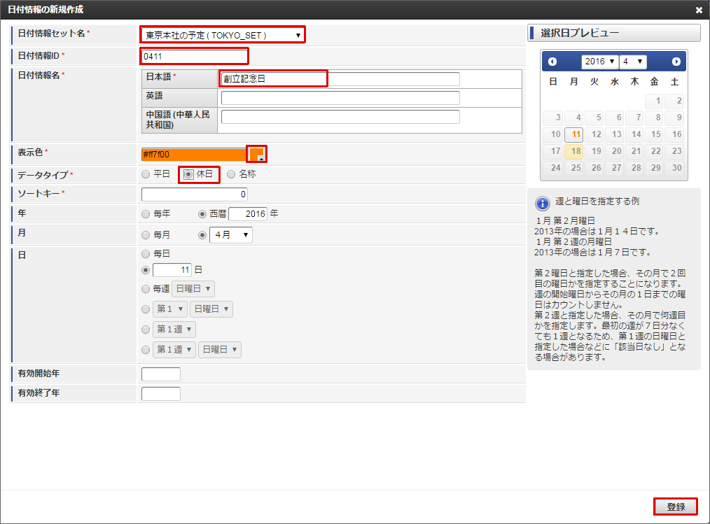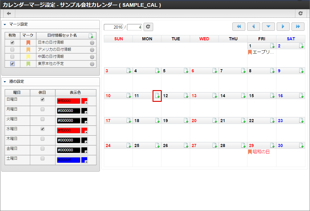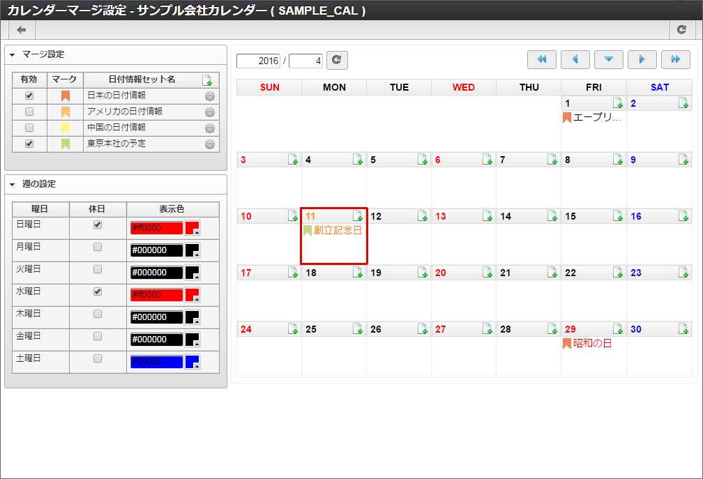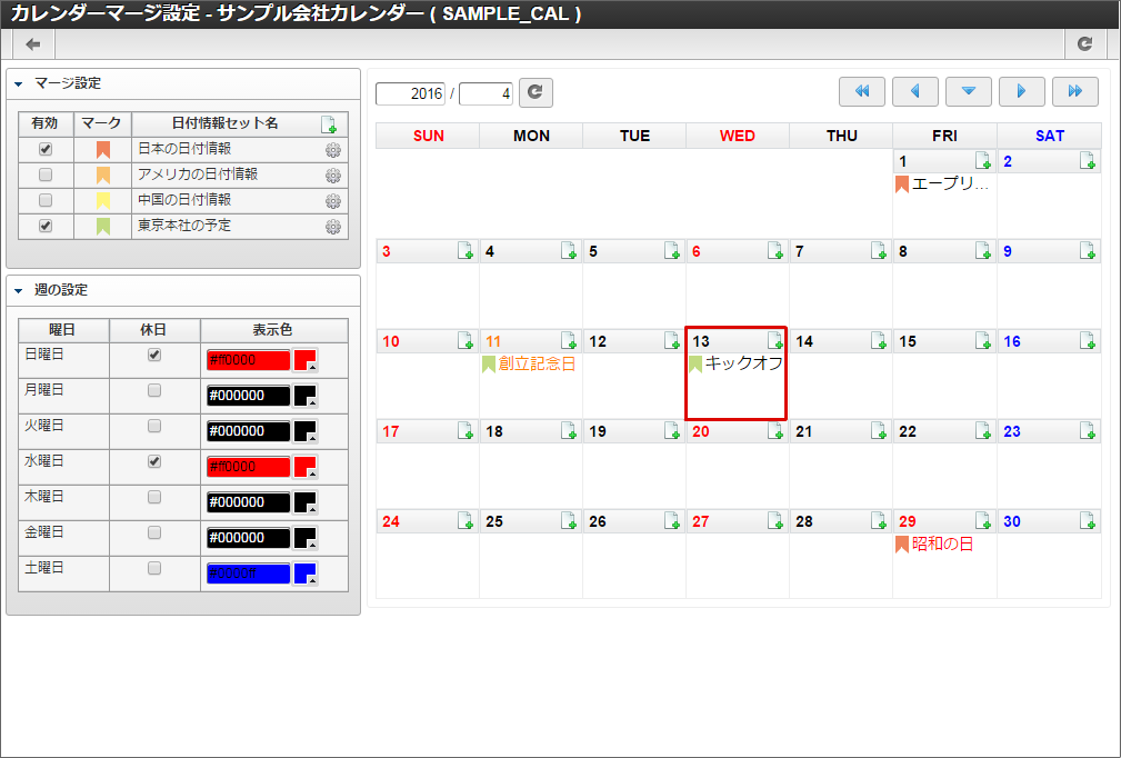 サンプル会社の休日である「創立記念日」と、休日に行われる社内イベントの「キックオフ」を、サンプル会社カレンダーに表示します。4/11は月曜日なので本来は出勤日(平日)ですが、創立記念日で会社の休日となるため(休日)に変更します。4/13は水曜日なので本来はサンプル会社の(休日)ですが、キックオフが行われるため出勤日(平日)に変更します。