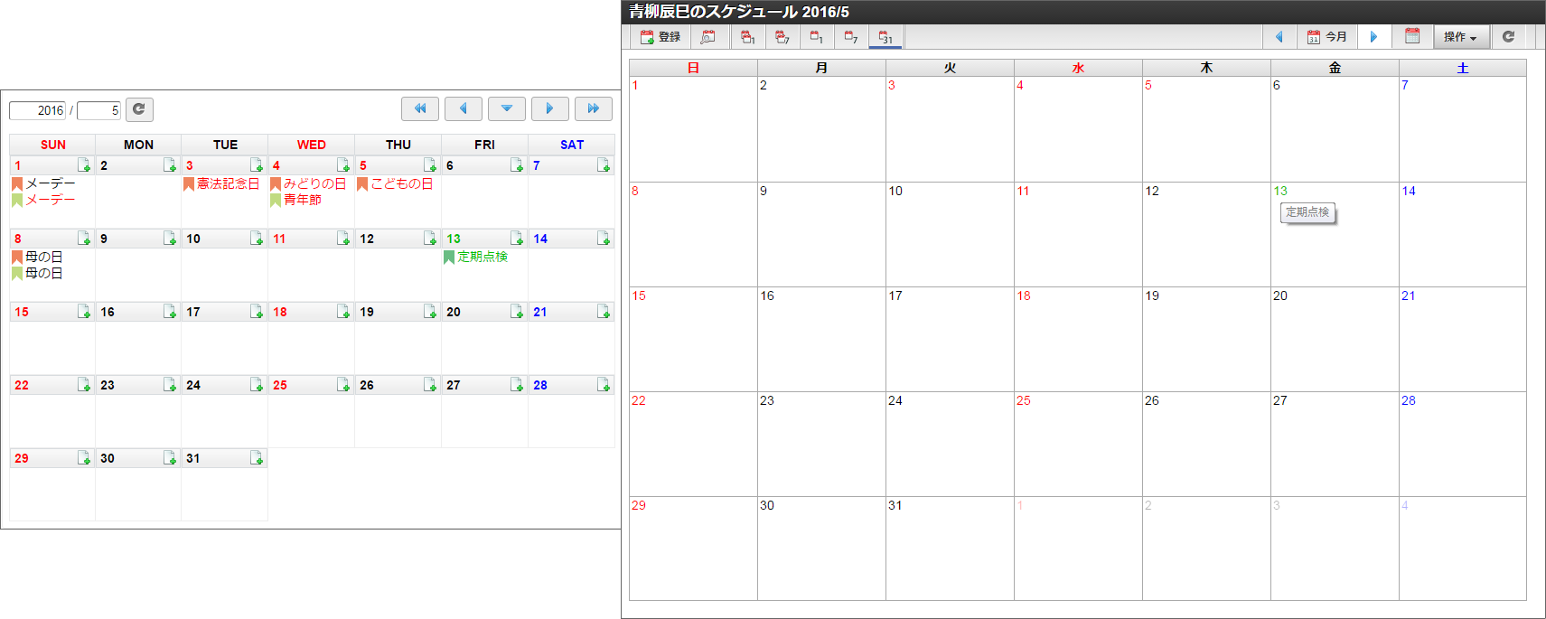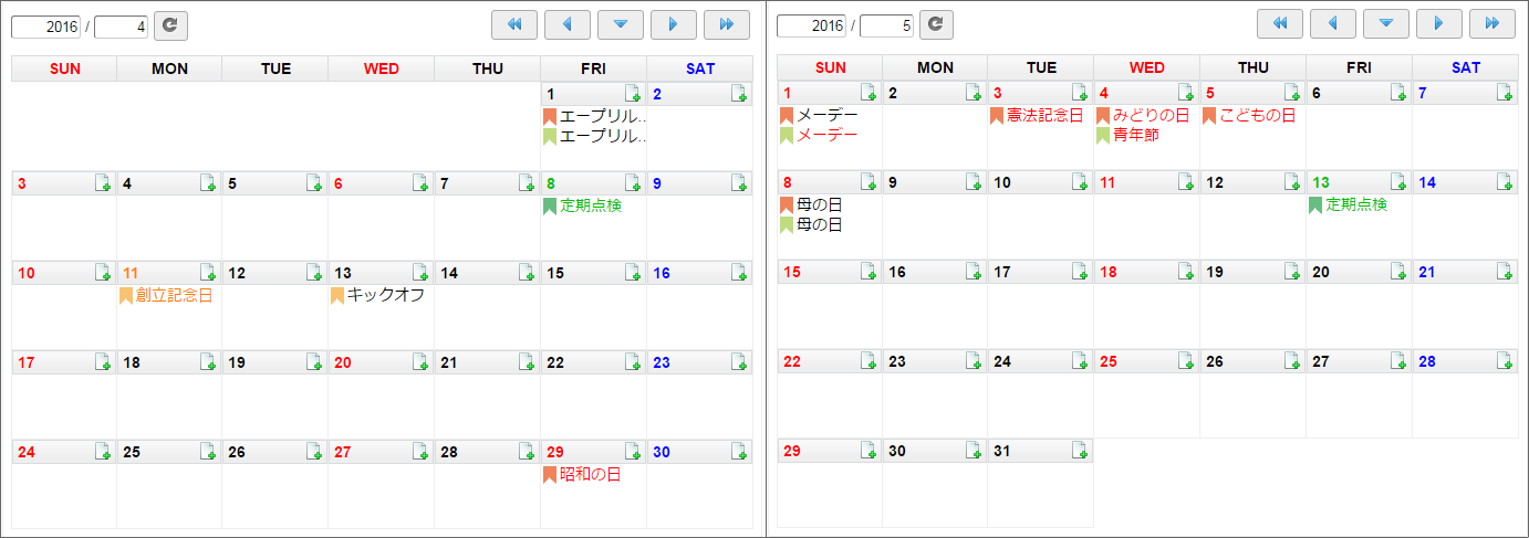 サンプル会社東京本社と中国工場の予定、日本と中国の祝日を設定したカレンダーを作成できました