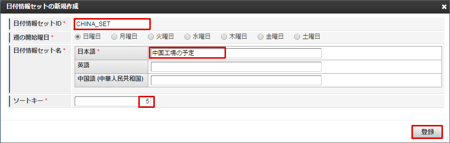 マージ設定 - 中国の日付情報と中国工場の予定の有効チェックボックスにチェックを入れます。