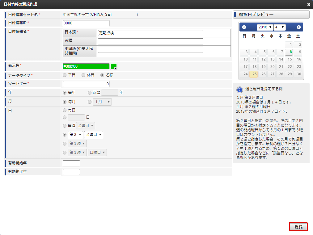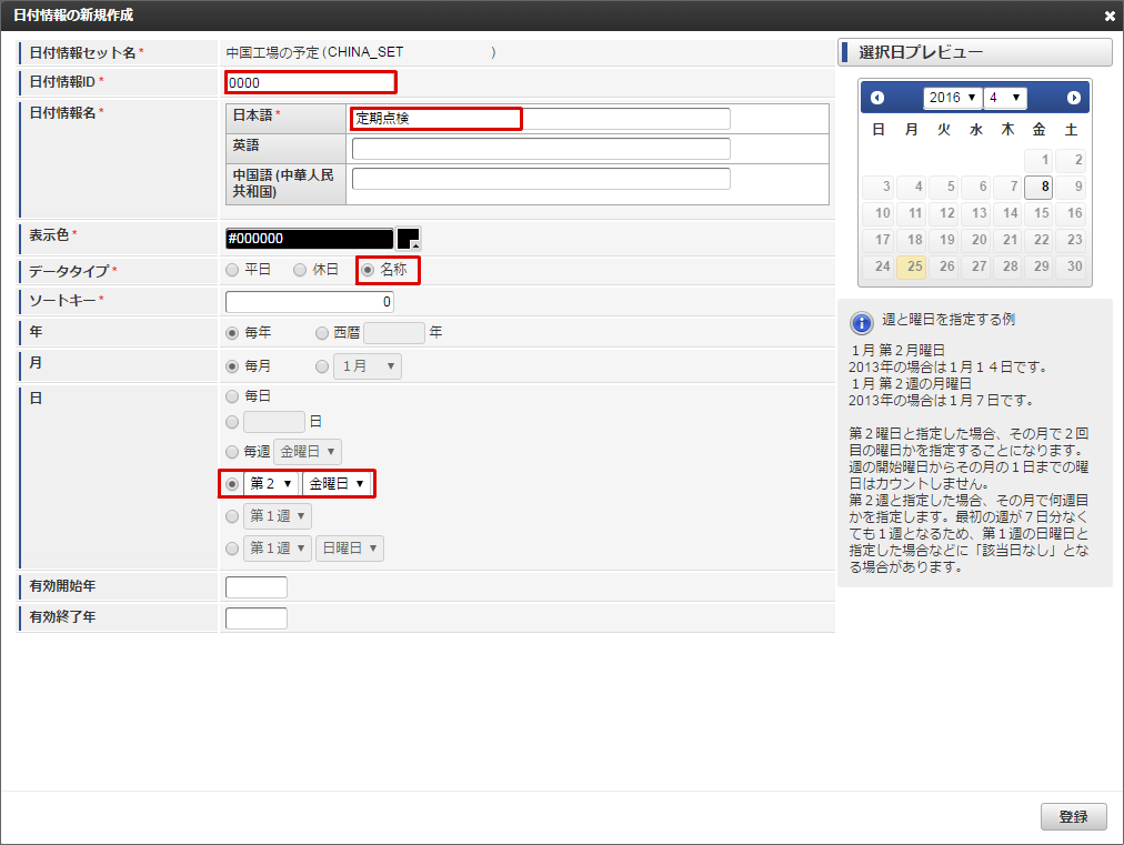 毎月第2金曜日を「定期点検」として登録します。以下を選択・入力します。