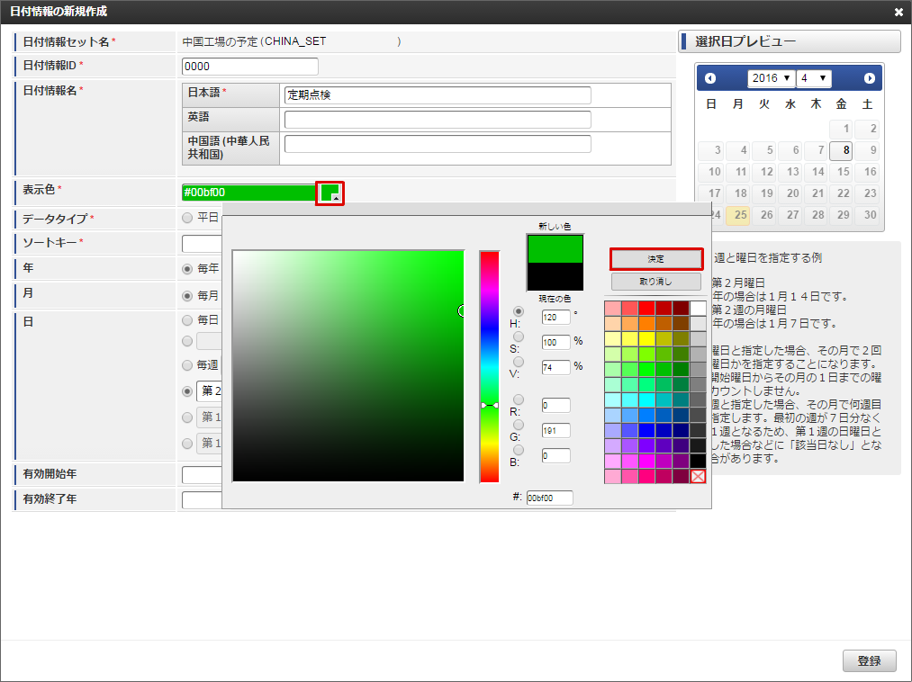 表示色プルダウンをクリックし、「定期点検」の表示色を選択します。選択が終わったら「決定」をクリックします。