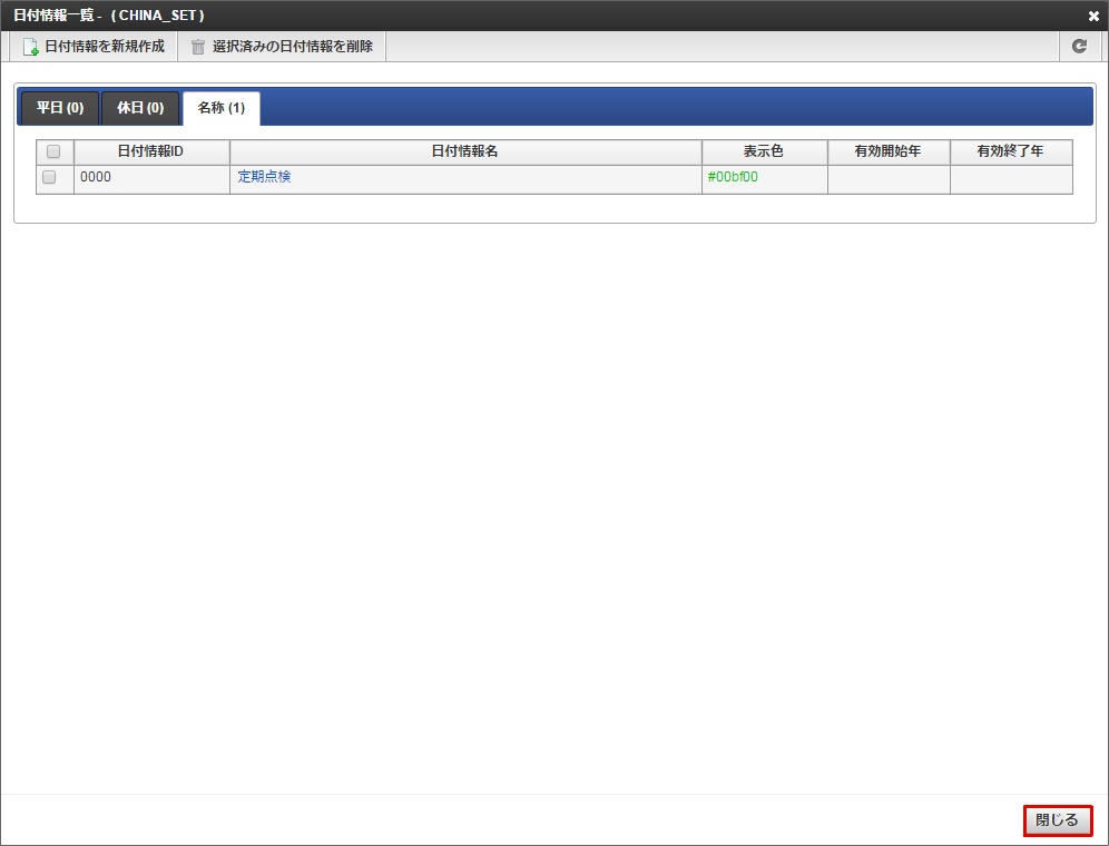 名称タブに「定期点検」を登録できました。「閉じる」をクリックします。