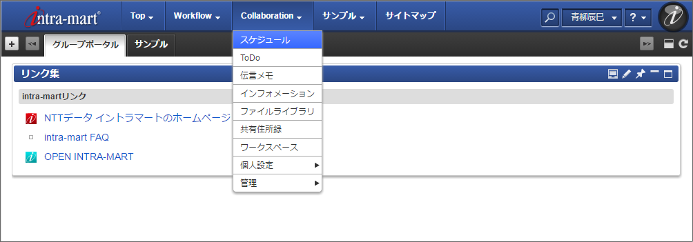 このステップでは、intra-mart Accel Collaboration のスケジュールにサンプル会社カレンダーが表示されることを確認します。注意
