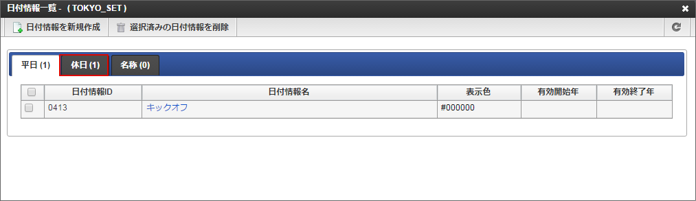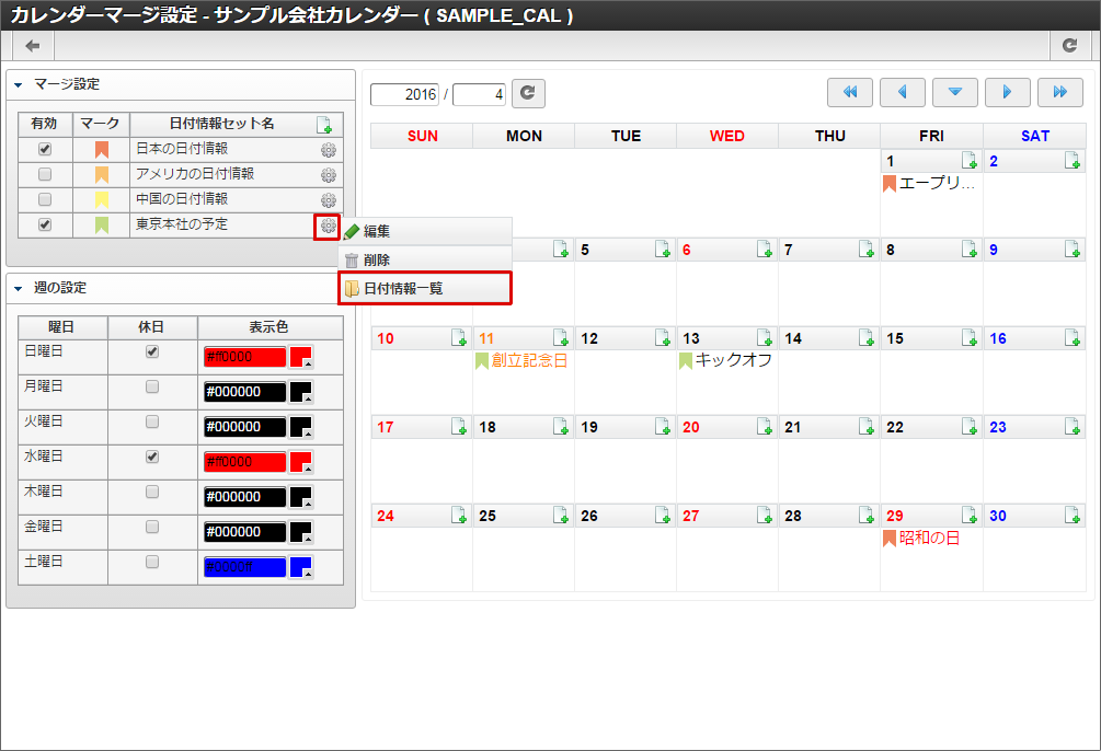 創立記念日を(休日)、キックオフを(平日)として登録できていることを確認します。マージ設定 - 東京本社の予定の「操作メニュー表示」アイコンを右クリックし、「日付情報一覧」をクリックします。4/13のキックオフが(平日)として登録されていることを確認できました。「休日」をクリックします。