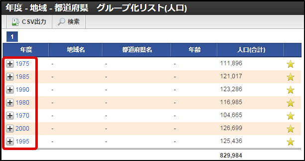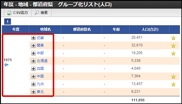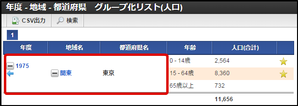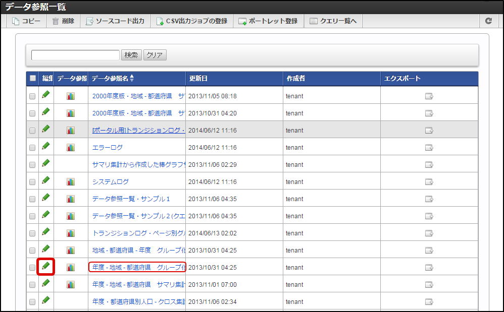 一覧中に表示されているサンプル「年度 - 地域 - 都道府県 グループ化リスト(人口)」の編集アイコンをクリックします。