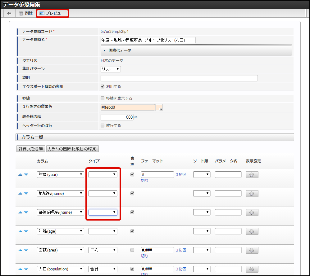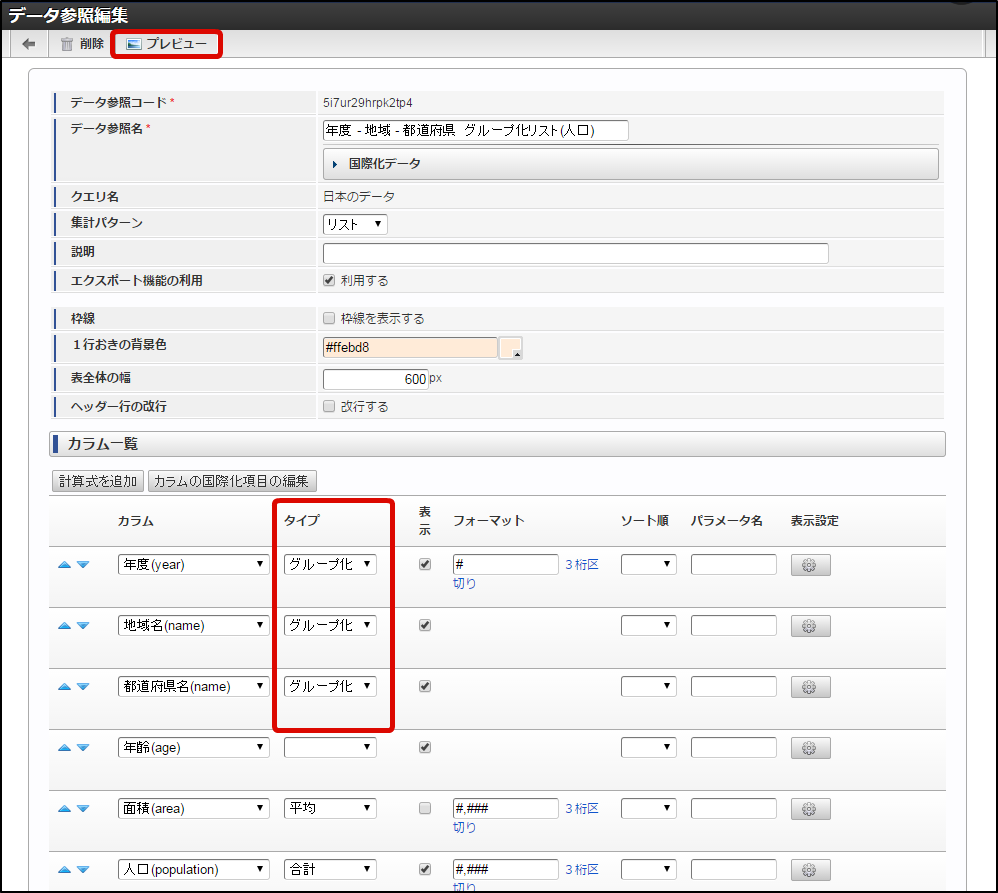 「カラム一覧」にある、「年度(year)」、「地域名(name)」、「都道府県名(name)」の タイプ に”グループ化”が設定されている事を確認し、画面上部の「プレビュー」をクリックします。