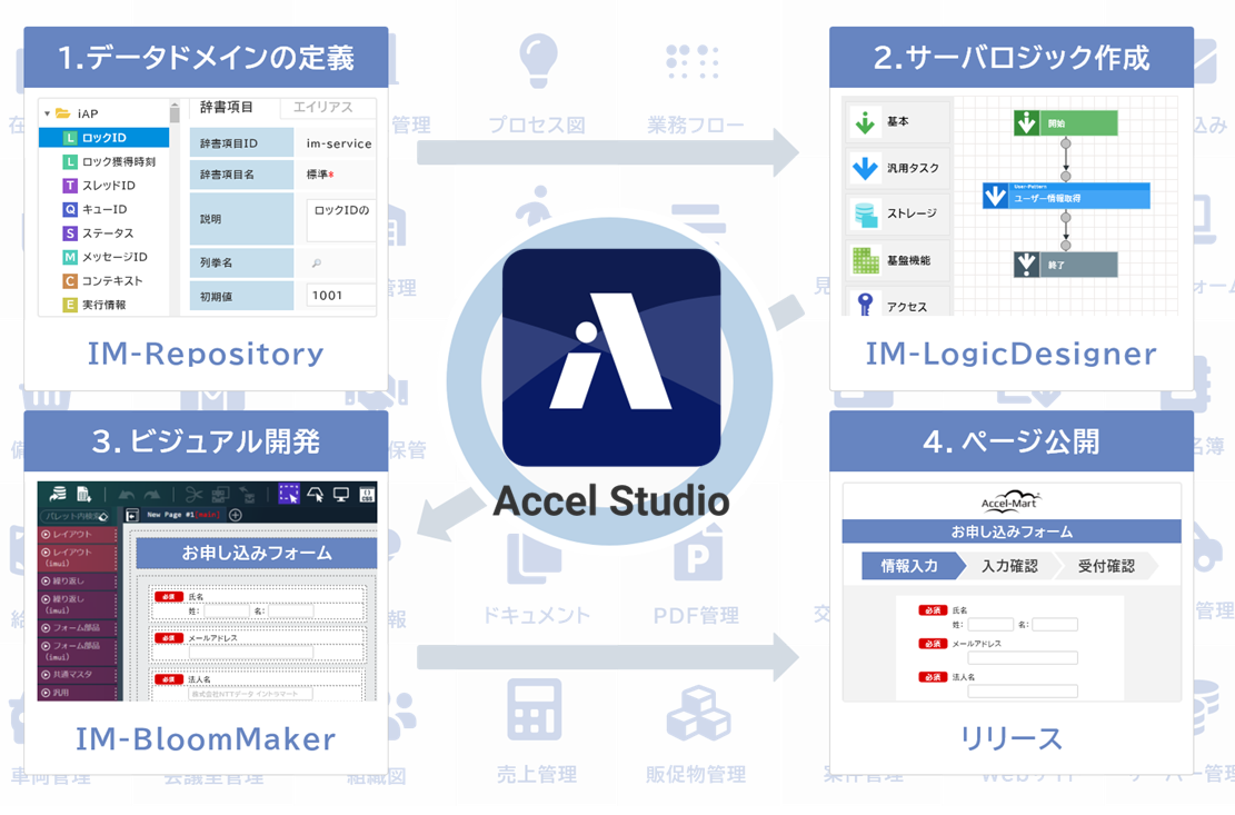 | ローコードツールの管理 | Accel Studio | IM-BloomMaker、LogicDesigner、IM-Repository、ViewCreatorなどのローコード資材をまとめて管理