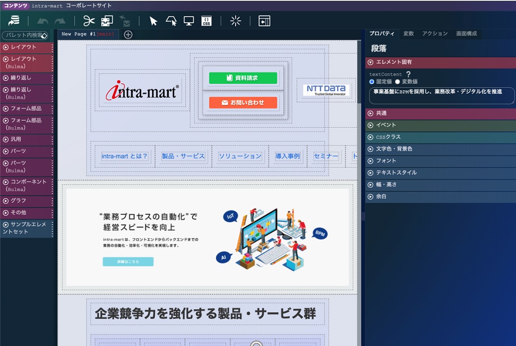 IM-FormaDesigner/ IM-BIS IM-BloomMaker 特徴 紙ベース帳票の電子化が容易。登録や参照などのサーバロジックが自動生成される。 画面作成に特化している。IM-FormaDesigner/ IM-BISより自由度の高いアプリ画面を作成できる。 画面デザイン 自由度は低い。単純な帳票なら簡単に作成可能。 自由度が高く CSS を独自定義可能。
