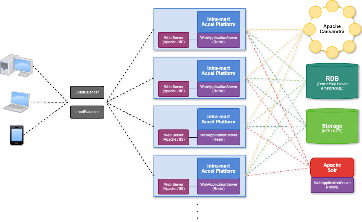 RDB intra-mart Accel Platform の各種マスタデータやトランザクションデータの保存先として、利用します。 intra-mart Accel Platform では、接続先のRDB製品として、Oracle、SQLServerPostgresSQLをサポートしています。Storage intra-mart Accel Platform で利用する添付ファイルや各種ドキュメントの電子ファイルの保存先として利用します。 intra-mart Accel Platform の設定により格納先を任意の場所に指定ができますが、複数のWeb/APサーバにて運用している場合は、すべてのWeb/APサーバで同一のディスク領域を操作できるNFSやCIFSなどのストレージサーバを用意する必要があります。Apache Cassandra ApacheFoundationが提供しているオープンソースのNoSQLサーバで、IMBoxを利用する場合には別途必要です。(IMBoxを利用しない場合、Apache Cassandraサーバの設置は不要です。)Cassandra自体で、冗長化する機構を保持していますが、cassandraとIMBoxの仕様上、冗長化とデータの一貫性を求める場合は、3台以上のCassandraでの運用を推奨します。Apache Solr IM-ContentsSearchで利用するApacheFoundationが提供しているオープンソースの検索エンジンです。Apache Solrもintra-martと同じく、Webアプリケーションサーバですので、Apache Solrの稼働環境として、ResinやJettyなどWebアプリケーションサーバが必須です。(IM-ContentsSearchを利用しない場合、Solrサーバの設置は不要です。)