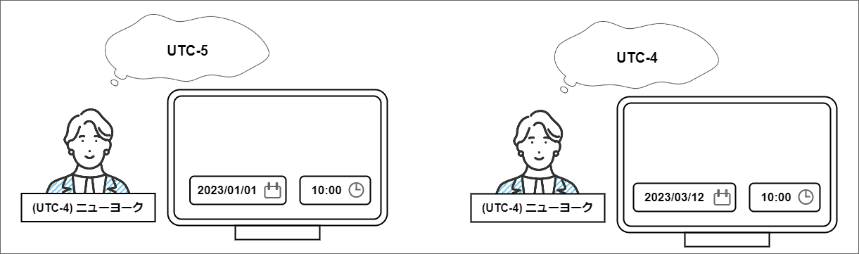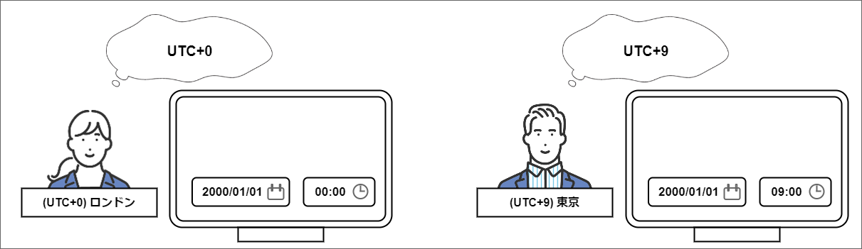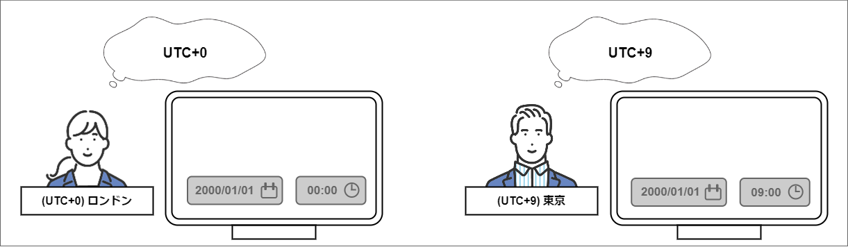 - ユーザの設定に応じた日付や日時の入力画面等のユーザインタフェースによるユーザからの入力については、ユーザのタイムゾーンに基づいていることを想定する必要があります。