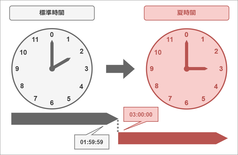夏時間開始時は、“01:59:59” から “03:00:00” に1時間進められました。これにより2時台がスキップされました。
