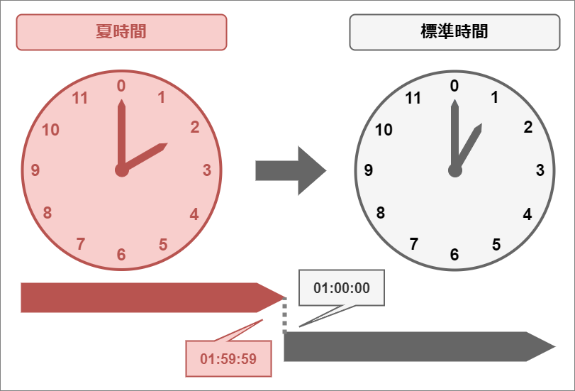 夏時間終了日は、1時間戻されることで、重複する時間帯が存在し、25時間で1日が終わります。