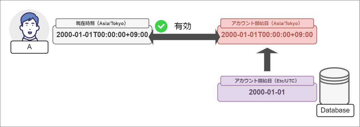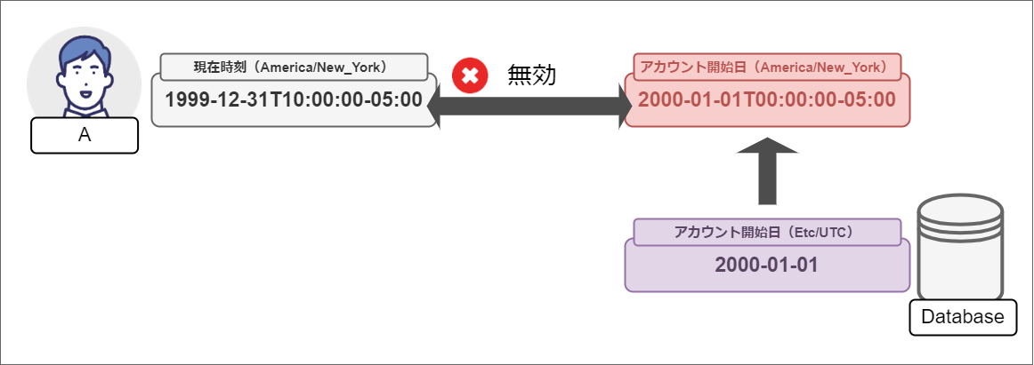 日付は相対的に扱われるため、ニューヨーク(America/New_York)のユーザは “2000-01-01T00:00:00-05:00” からアカウントが有効となるため、“1999-12-31T10:00:00-05:00” 時点では無効なアカウントとして扱われます。