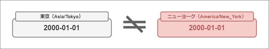 一般的に、東京(Asia/Tokyo)の “2000-01-01” という日付は、ニューヨーク(America/New_York)ではタイムゾーンが異なるので “1999-12-31” を意味している可能性があります。