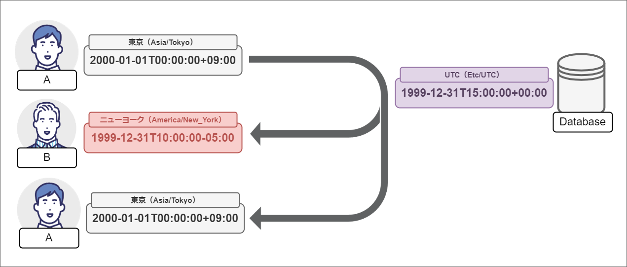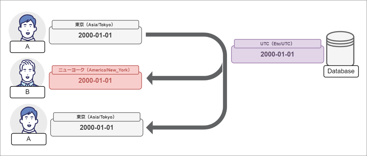 これを日時で考えると、“2000-01-01” という日付が保存されていた場合に、東京(Asia/Tokyo)のユーザでは “2000-01-01T00:00:00+09:00” から “2000-01-01T23:59:59+09:00” を意味していて、ニューヨーク(America/New_York)のユーザでは “2000-01-01T00:00:00-05:00” から “2000-01-01T23:59:59-05:00” を意味しています。