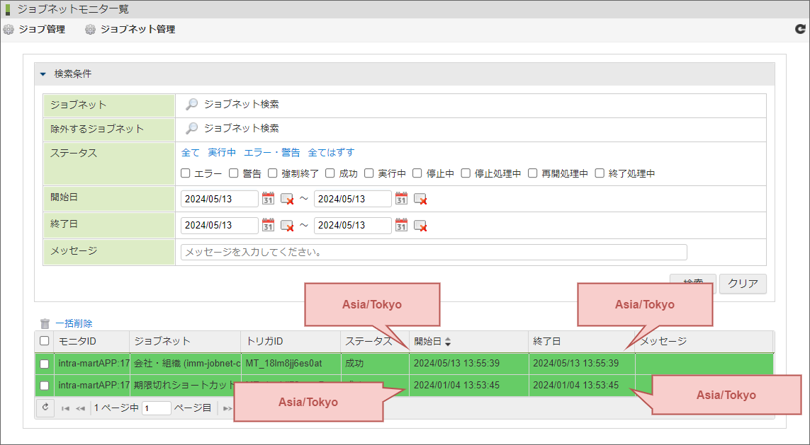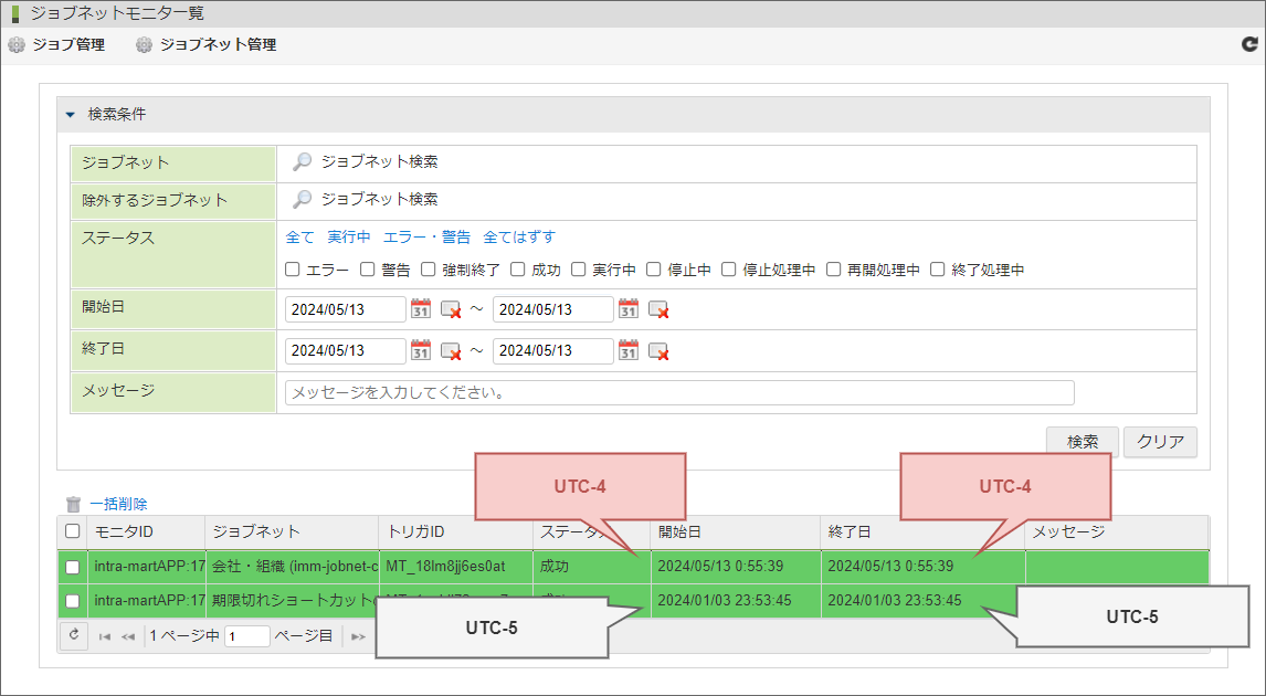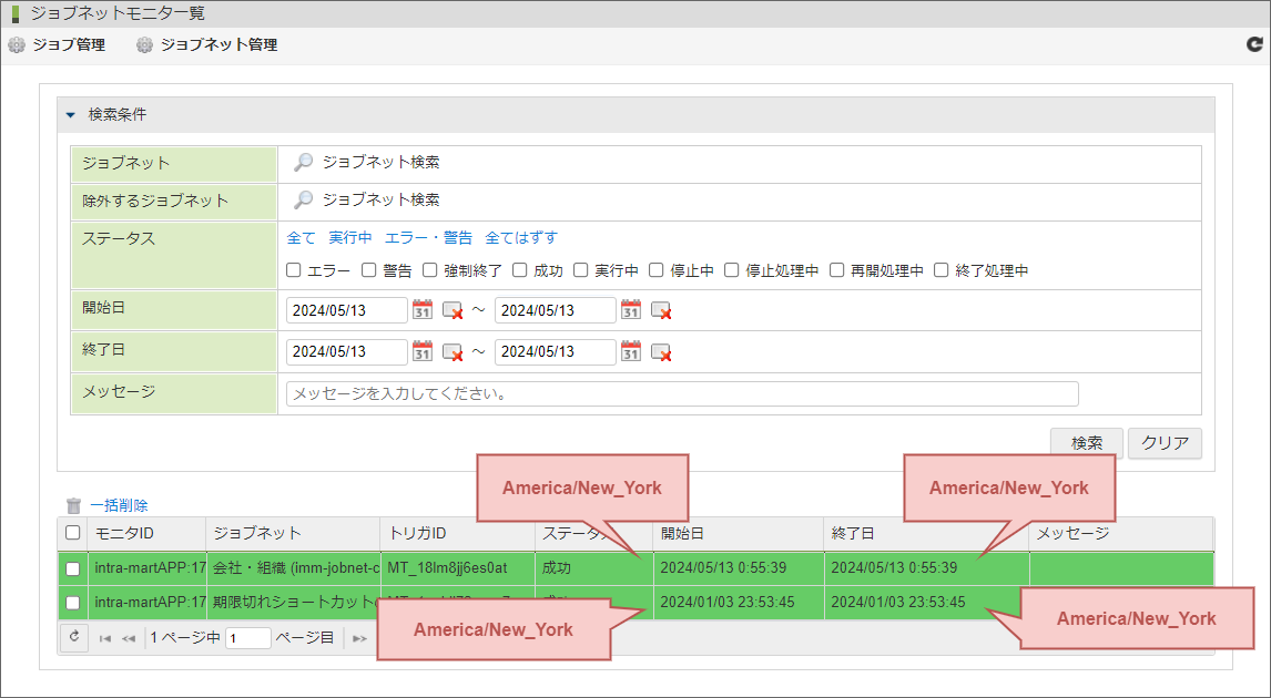 例えば、ログインユーザのタイムゾーンがニューヨーク(America/New_York)であった場合に、「ジョブネットモニタ一覧」に表示されるジョブネットの開始日と終了日は、ニューヨーク(America/New_York)の日時が表示されます。