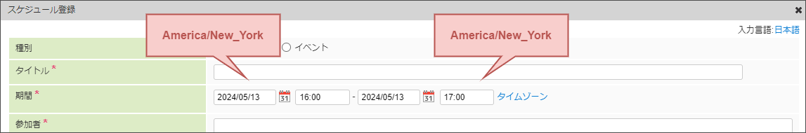 例えば、ログインユーザのタイムゾーンがニューヨーク(America/New_York)であった場合に、「スケジュール登録」から期間を入力したとします。