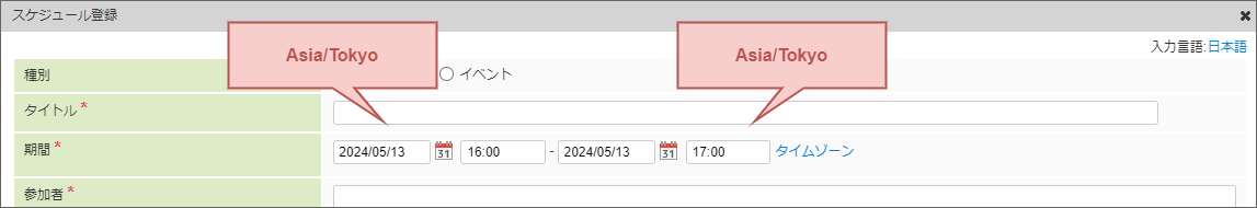 ログインユーザのタイムゾーンが東京(Asia/Tokyo)だった場合には、入力値は東京(Asia/Tokyo)の日時として扱われます。