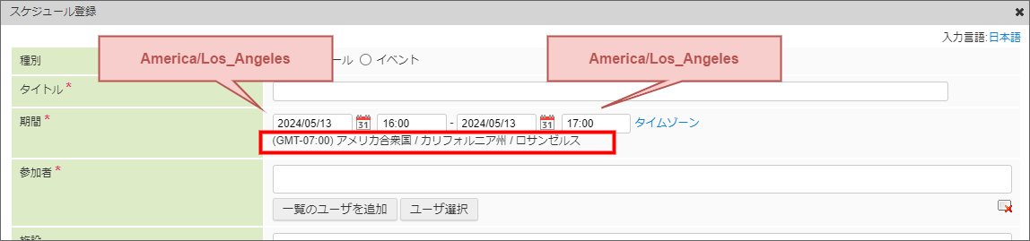 例えば、ログインユーザのタイムゾーンが東京(Asia/Tokyo)であった場合に、画面上でタイムゾーンとしてロサンゼルス(America/Los_Angeles)と入力すると、入力した日時はロサンゼルス(America/Los_Angeles)の日時として扱われます。
