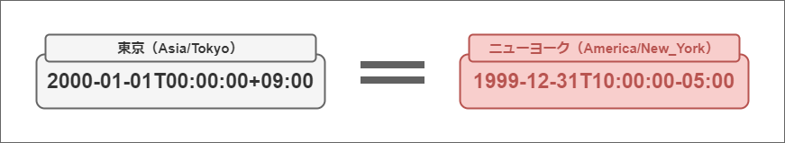 東京とニューヨークではタイムゾーンが異なるため、“2000-01-01T00:00:00+09:00” は “1999-12-31T10:00:00-05:00” と同じ日時を表しています。