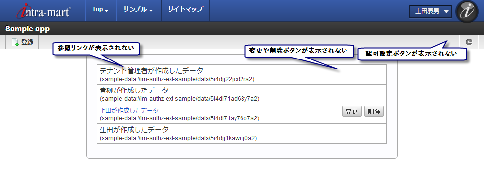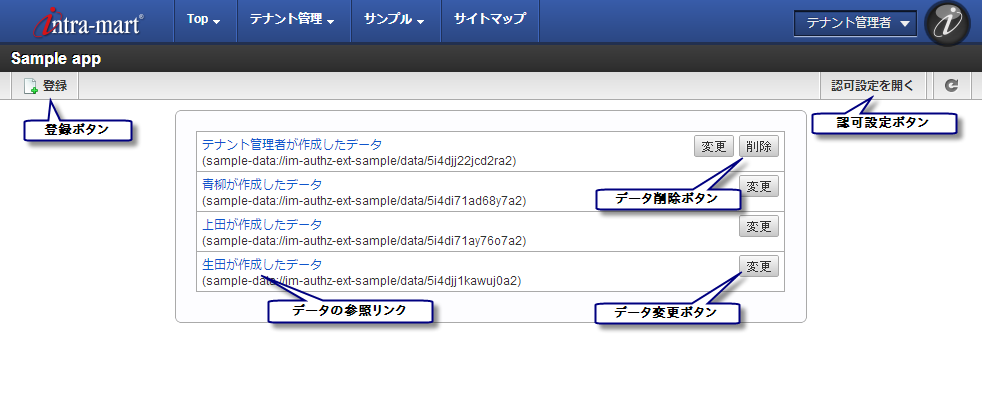 - 認可設定画面を使う権限がある人の場合、認可設定画面を開いてデータに対する権限を設定できます。 データを登録・削除すると認可機構のリソースも登録・削除されます