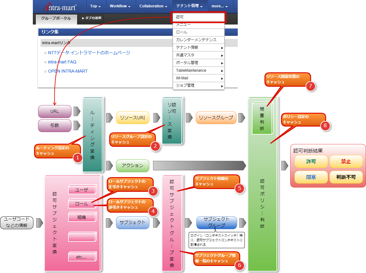 このように、認可の判断結果が確定するまでには多くの処理があり、各処理においてファイルやデータベースへのアクセスが発生します。そこで認可機能では、各処理のうちデータの更新頻度が低く、参照頻度が高いものについて、キャッシュを利用して高速化しています。