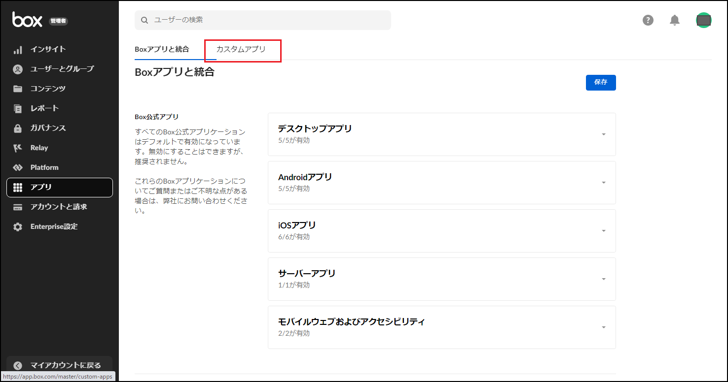 - 管理コンソールを開き、「カスタムアプリ」画面を開きます。