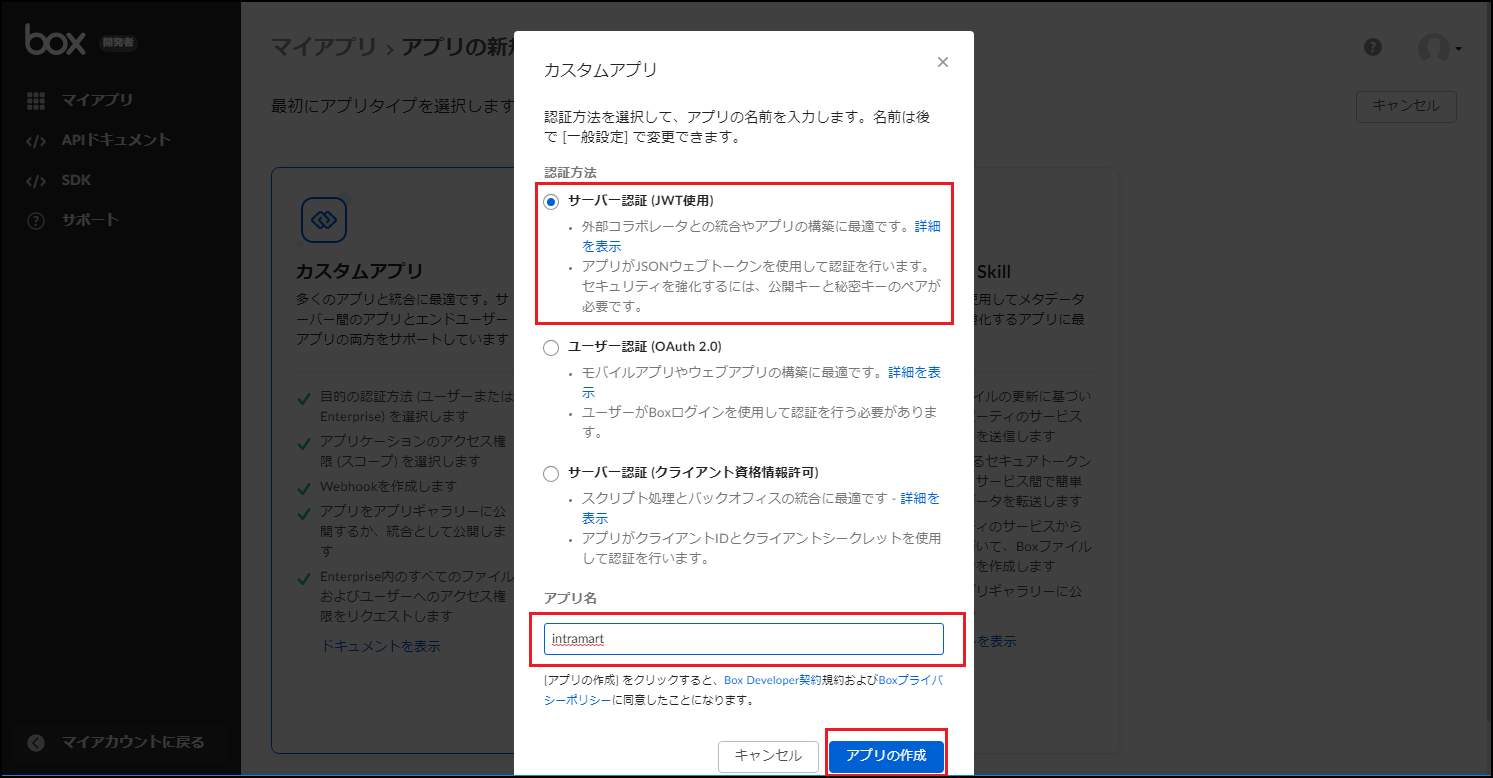 認証方式として「サーバー認証(JWT使用)」を選択し、「アプリ名」に任意のアプリケーション名を入力し、「アプリの作成」ボタンをクリックします。