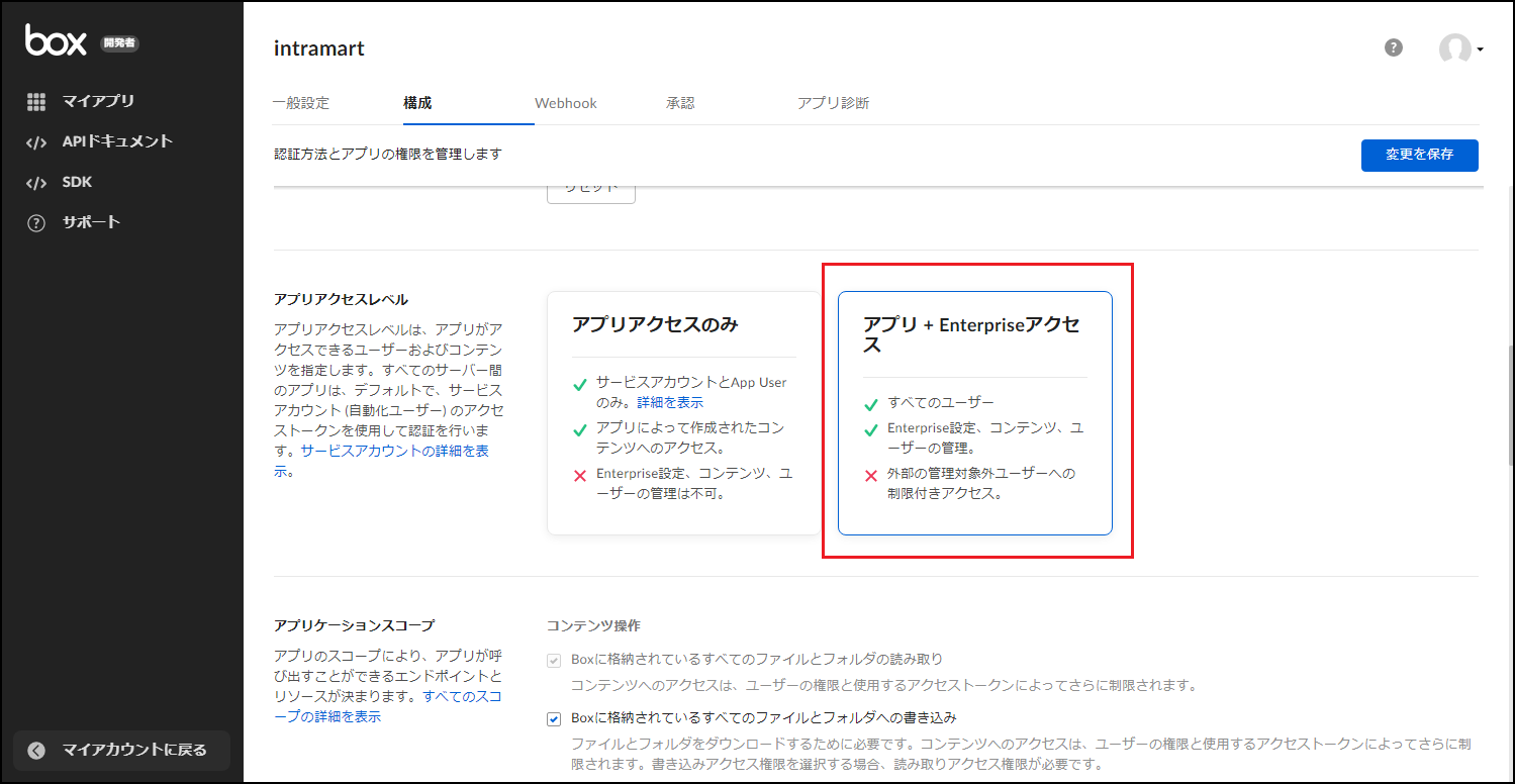 「アプリアクセスレベル」として「アプリ+Enterpriseアクセス」を選択します。