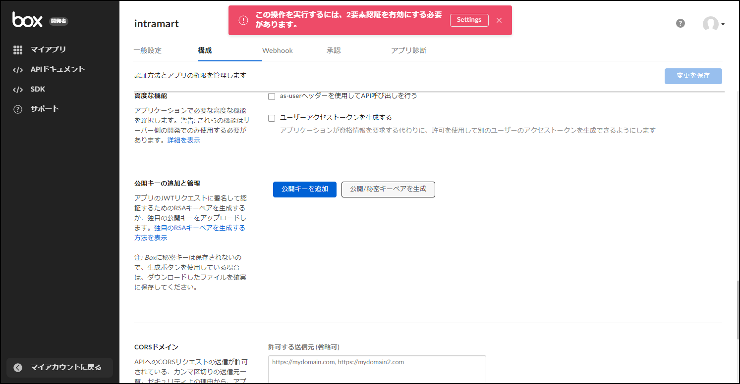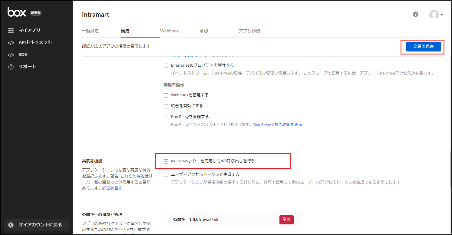 - 「高度な機能」として「as-userヘッダーを使用してAPI呼び出しを行う」を選択します。その後、「変更を保存」ボタンをクリックします。