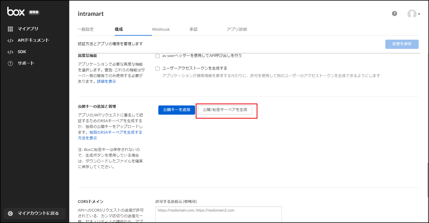 「公開キーの追加と管理」にて、「公開/秘密キーペアを生成」ボタンをクリックします。